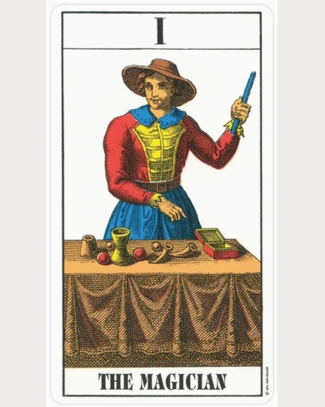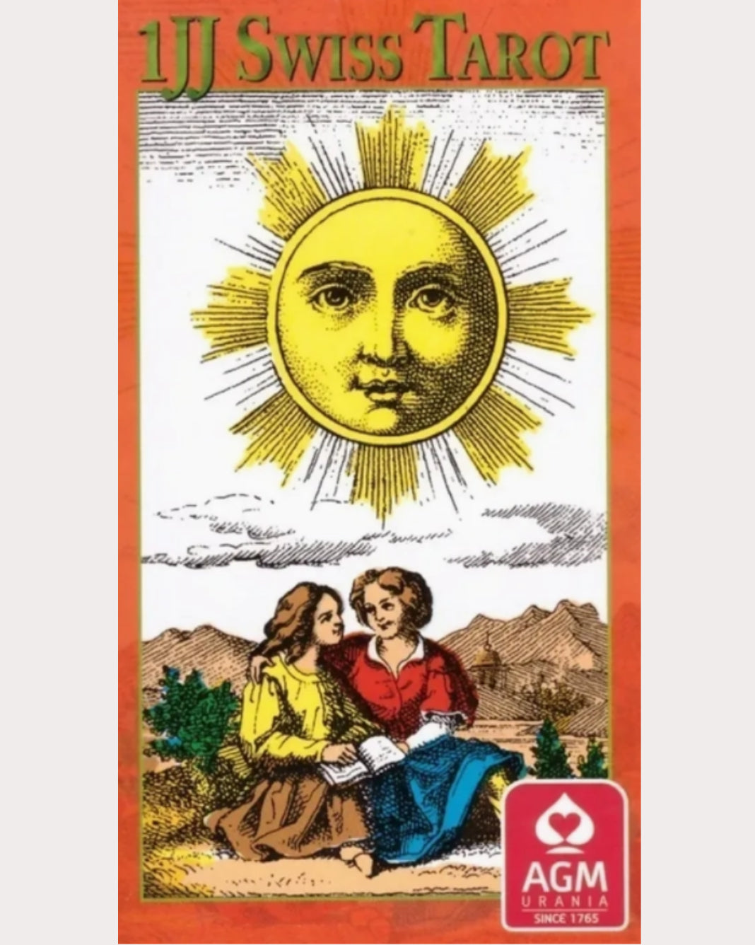 The 1JJ Swiss Tarot Deck is reprinted in full color from woodcuts based upon original tarot designs depicting 19th-century costumed figures. This classic Marseilles-style tarot deck is complete with 22 Major Arcana and 56 Minor Arcana cards, all with titles in English. The four suits of the Minor Arcana are the traditional Swords, Batons, Cups, and Coins. Also included is a ten-page pamphlet with Major Arcana interpretations and instructions for reading with the ten-card Celtic Cross spread.