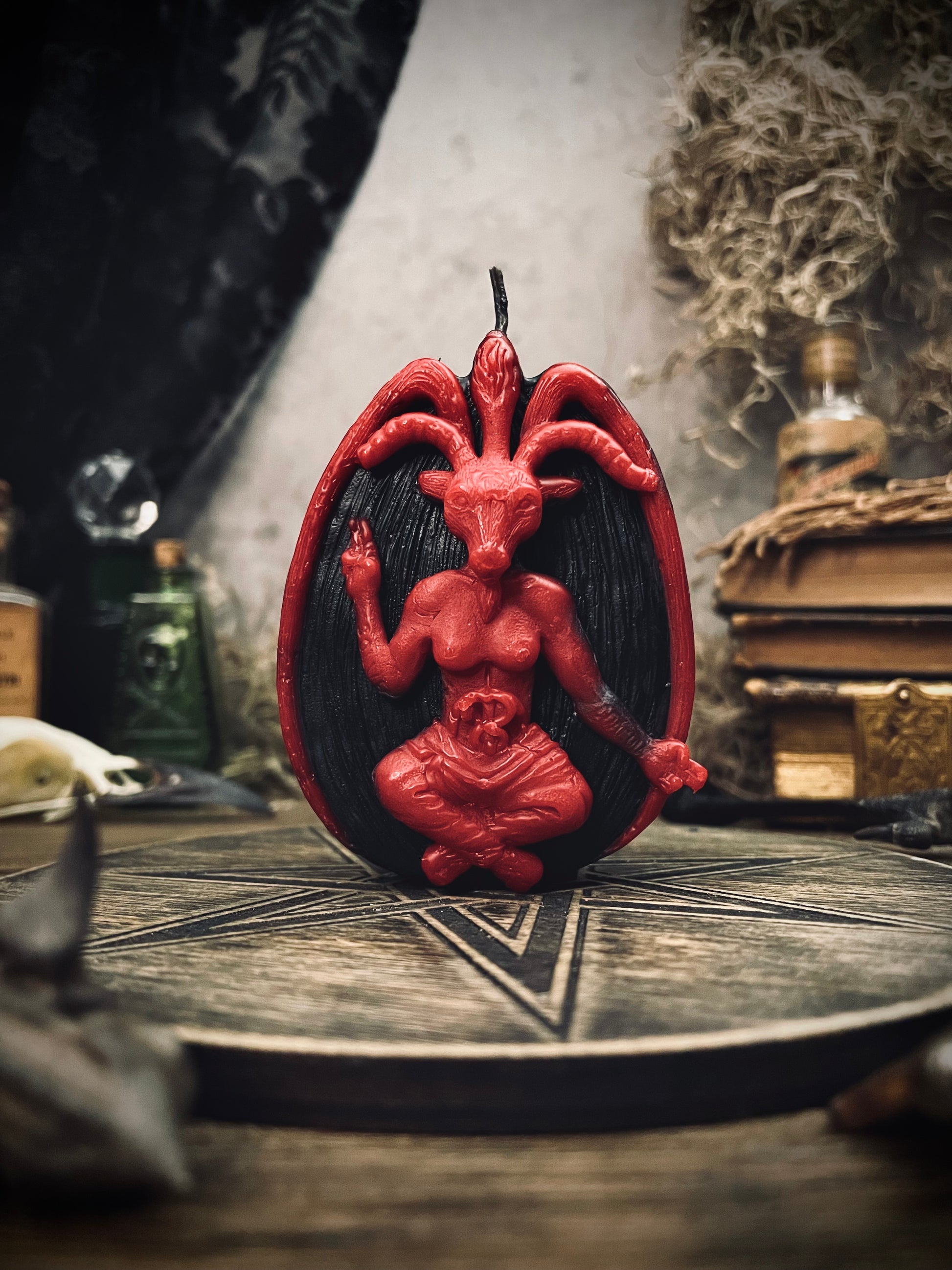 This 3", dual-colored candle depicts Eliphas Levi's famous Baphomet as the solve et coagula, the resolution of all opposites in a perfect absolute.