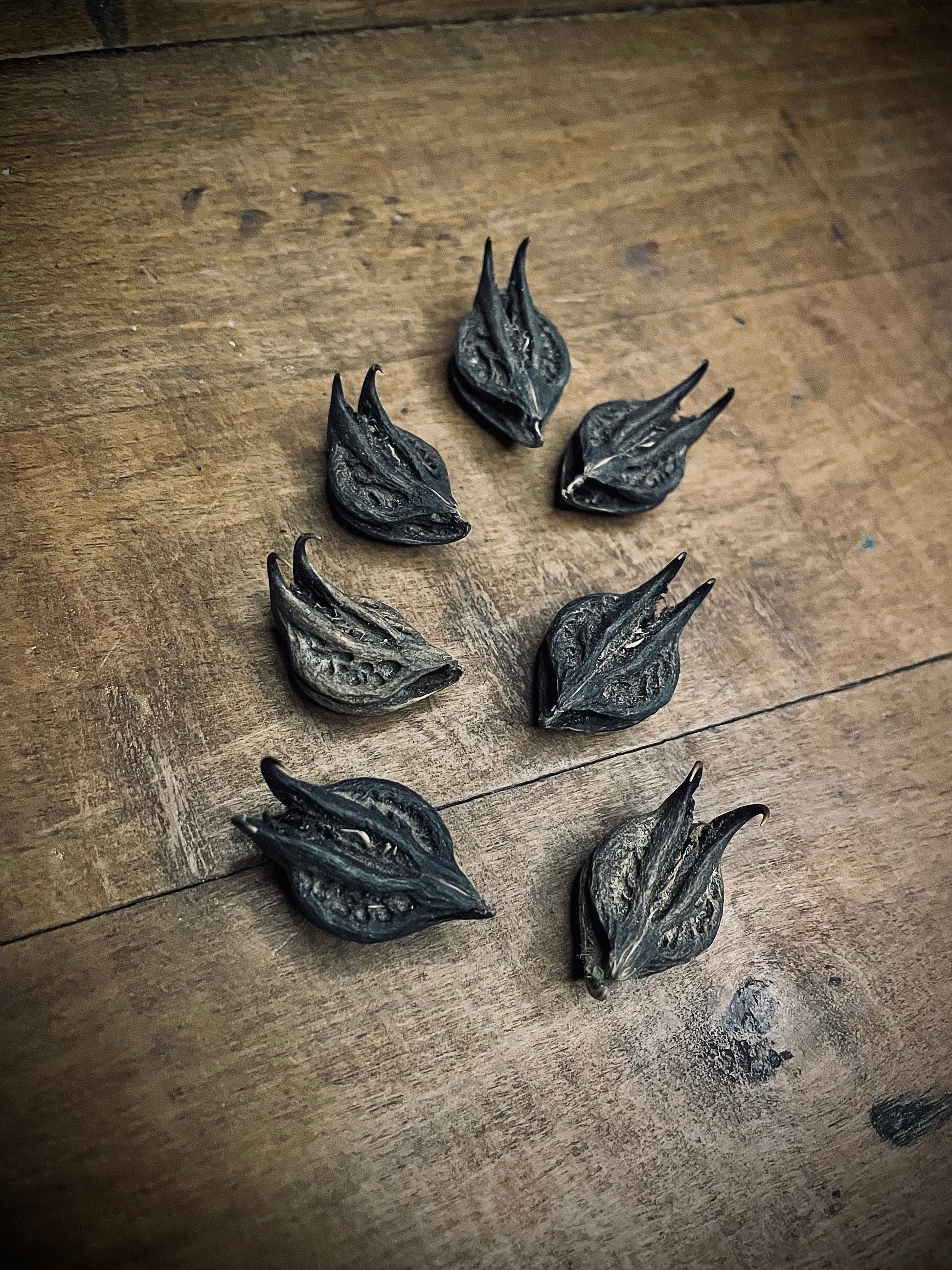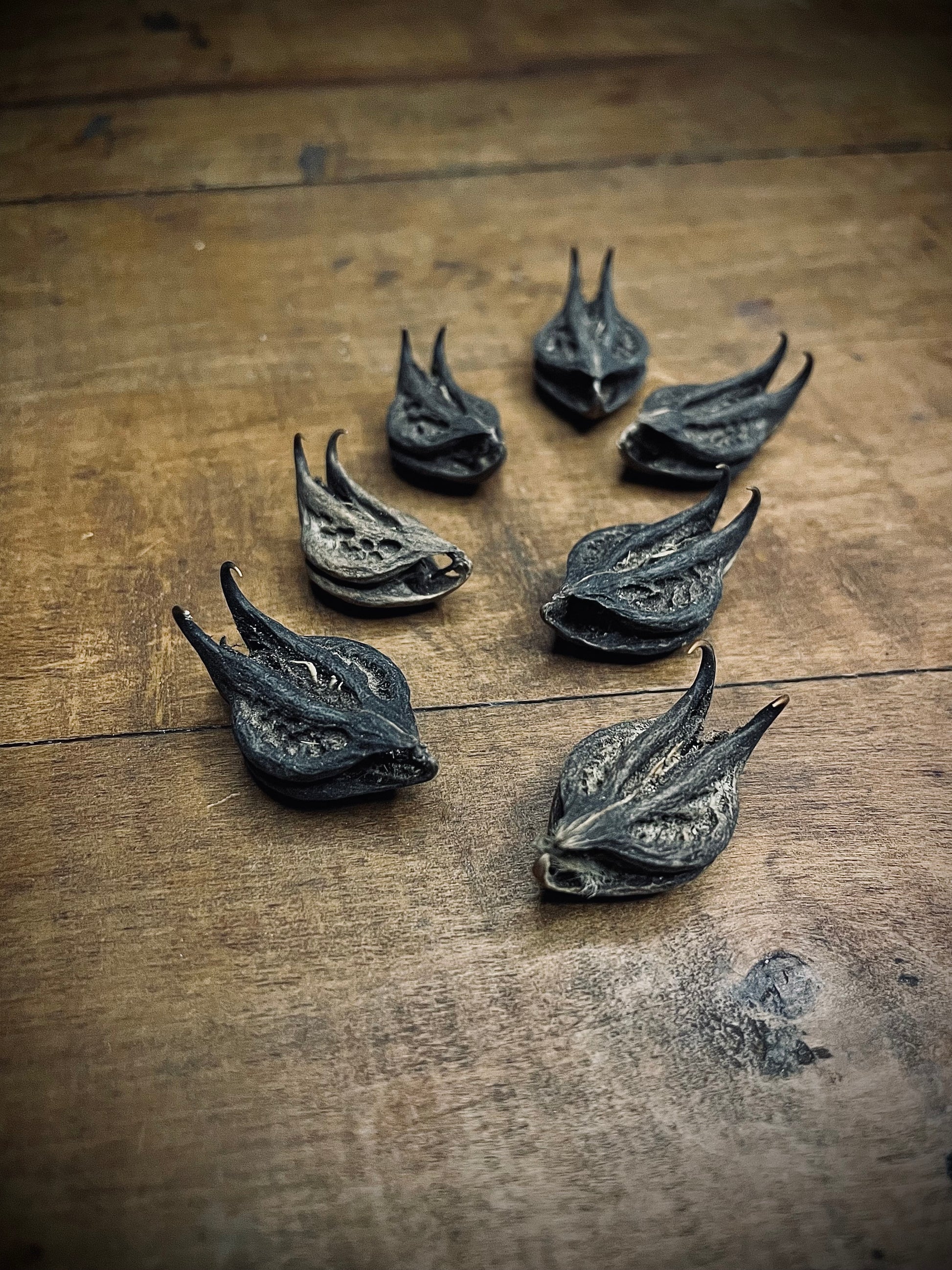 The bat’s head pod, colloquially called a bat’s head root, is the seed pod of a relative of the Devil’s Claw plant, and gets its name for its resemblance to the head and pointed ears of a bat.
