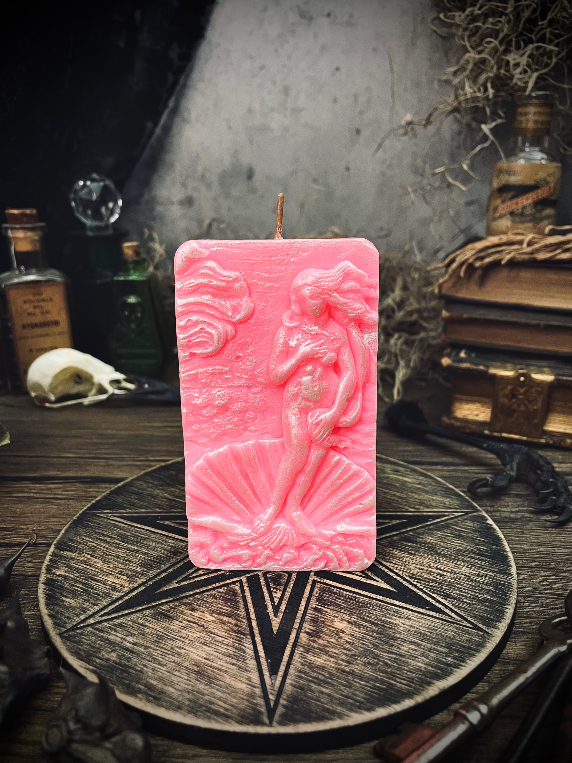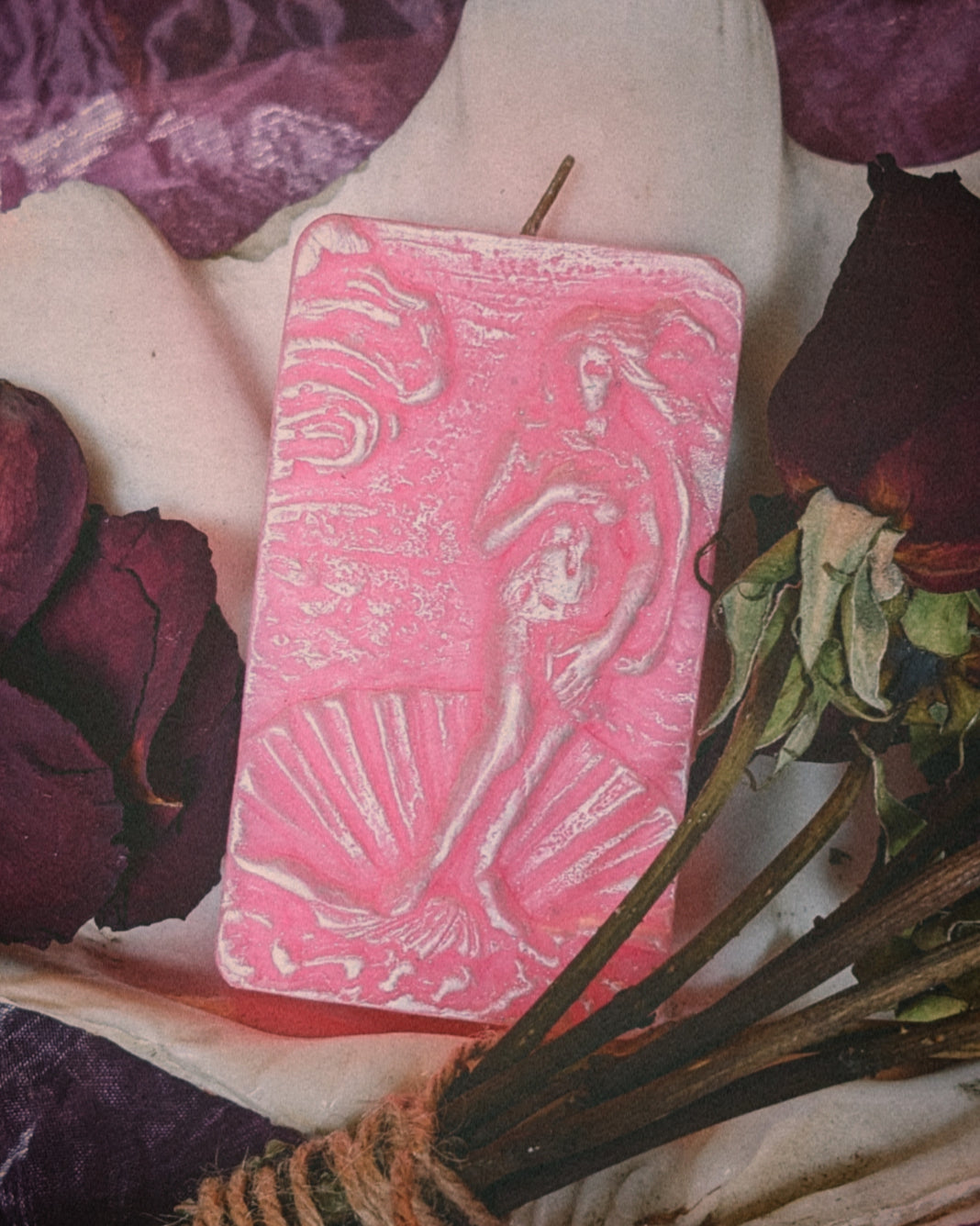 Burn this iridescent pink Venus candle, modelled on the famous Botticelli painting, for works of love and reinventing and reinvigorating self-image or libido. It may be dressed with our Love Drawing Herbal Blend, Come To Me Oil or Love Drawing Oil.