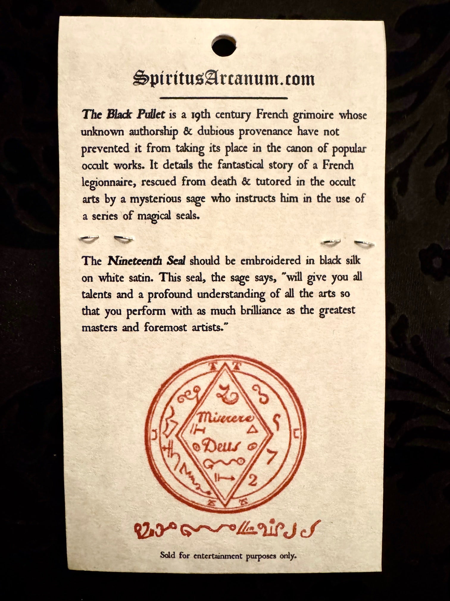 This metal medallion and patch set features the Ninteenth Seal from The Black Pullet. This seal, according to the grimoire, should be embroidered in black silk on white satin. When it is carried, it is said to "give you all talents and a profound understanding of all the arts so that you perform with as much brilliance as the greatest masters and foremost artists."