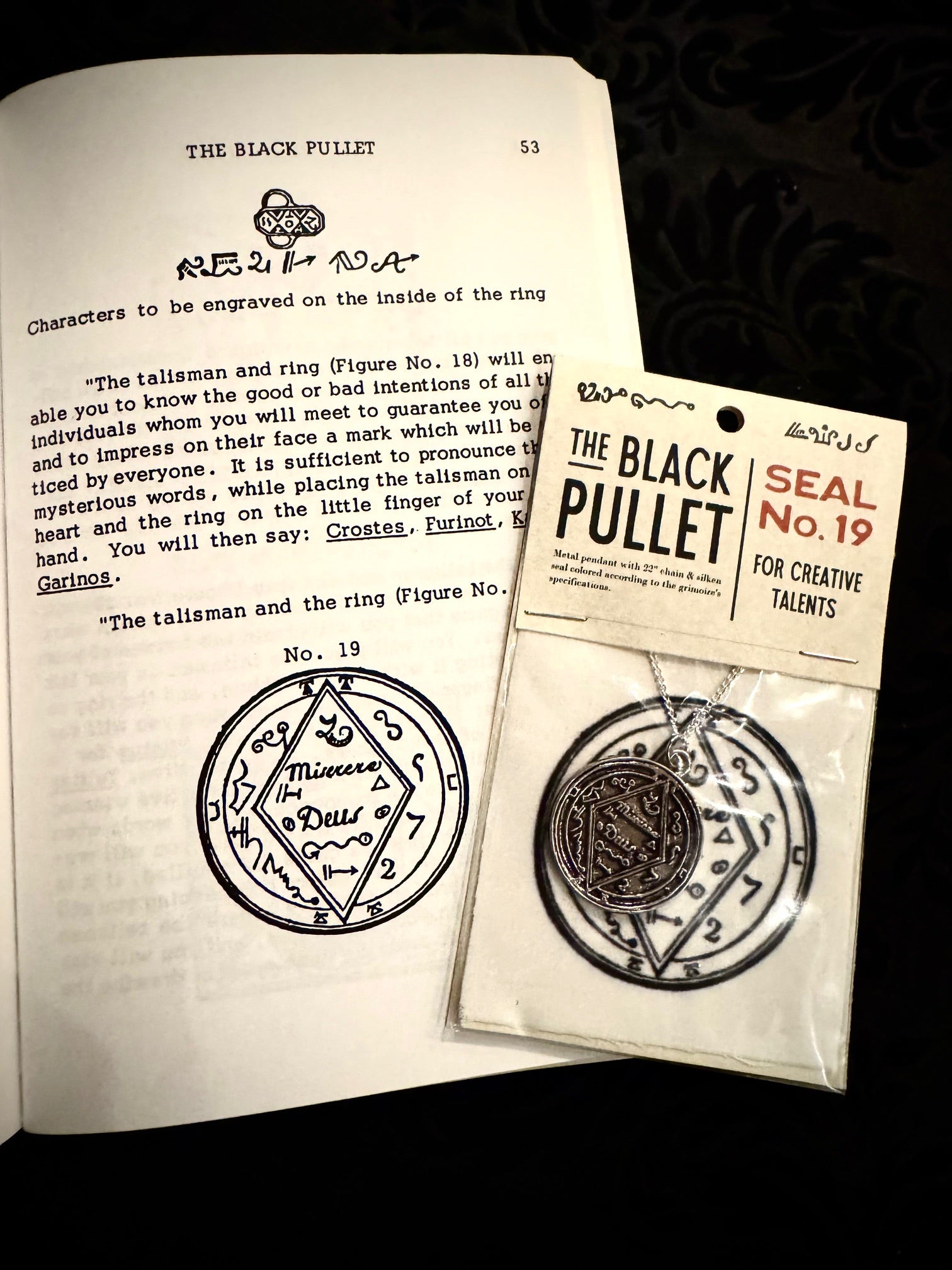 The Black Pullet is a 19th century French grimoire whose unknown authorship and dubious provenance have not prevented it from taking its place in the canon of popular occult works, where its ornate seals have entered the lexicon of folk magic. It details the fantastical story of a French legionnaire, rescued from death in the deserts of Egypt and tutored in the occult arts by a mysterious sage. In the depths of the sage's pyramid, the soldier is given a series of magical rings and occult seals embroidered in silk thread on colored satin, which accomplish a variety of wonders.
