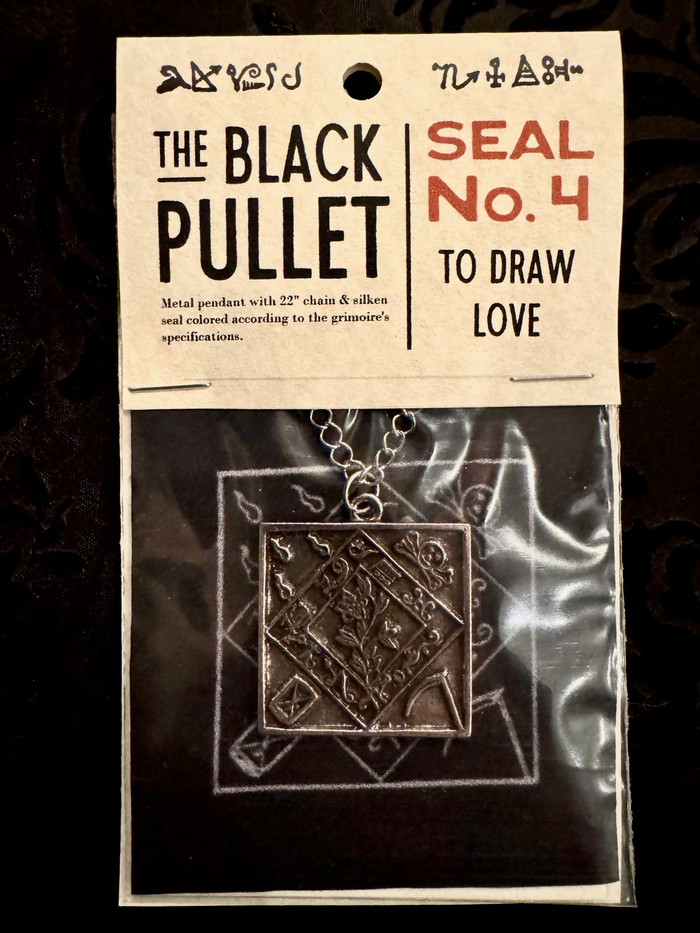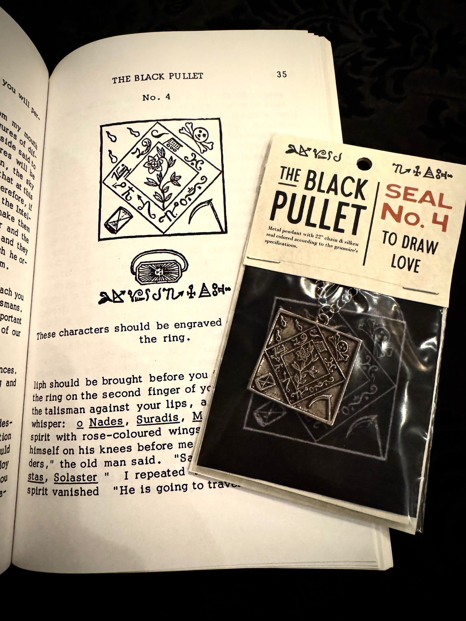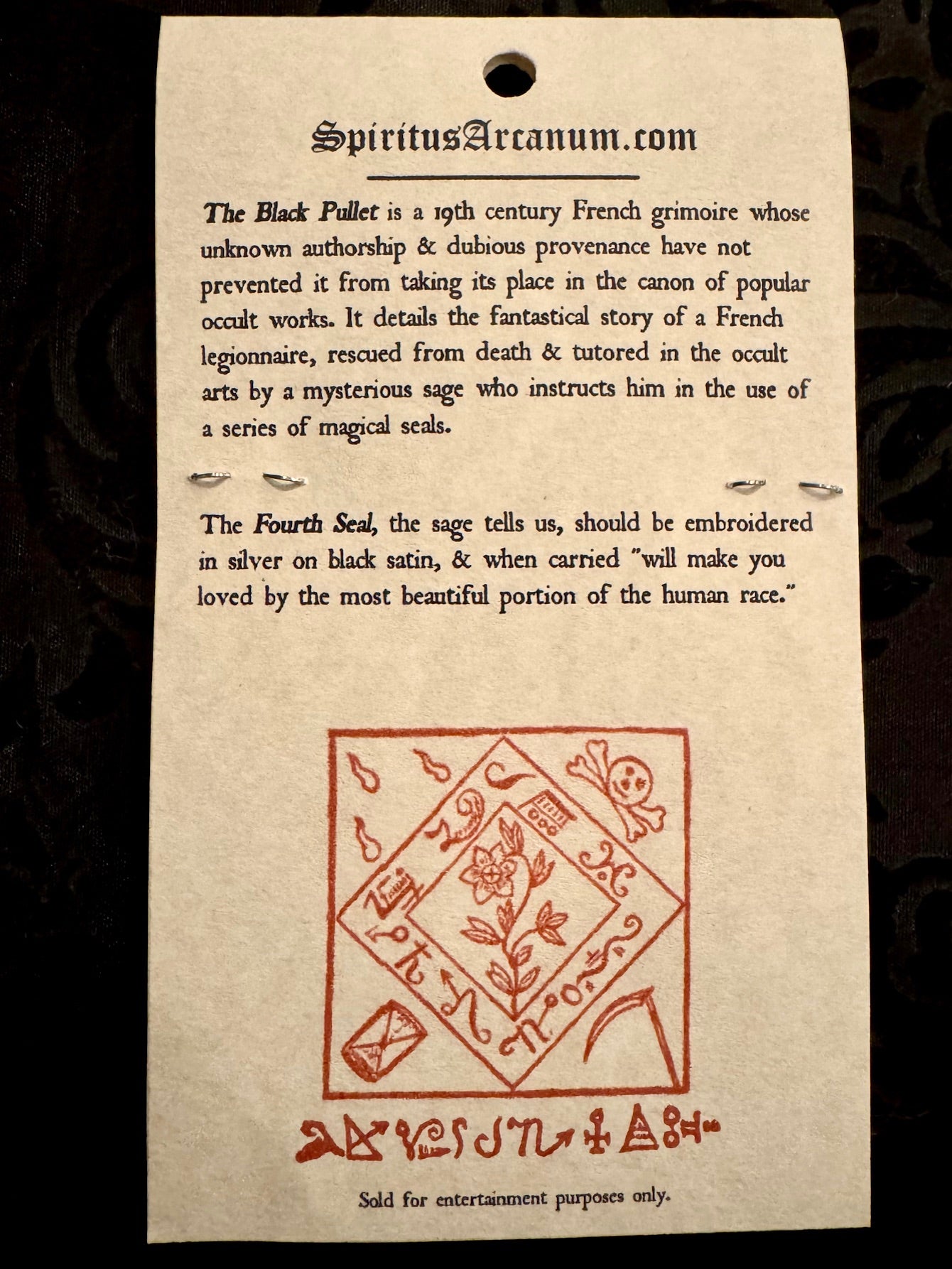 This metal medallion and patch set features the Fourth Seal from The Black Pullet. This seal, according to the grimoire, should be embroidered in silver on black satin, & when carried is said to "make [the bearer] loved by the most beautiful portion of the human race." Our set offers the seal in medallion form, on a 22" chain, and also includes a printed satin patch which may be carried, stitched onto clothing, or incorporated into a charm bag or other manner of spell working.