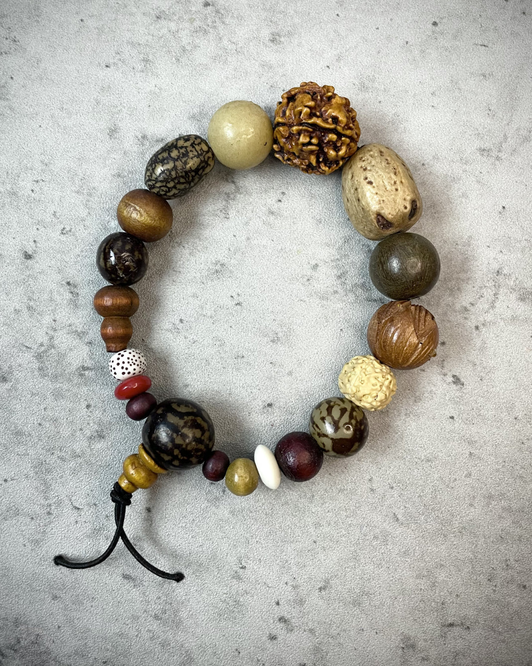 These handmade bracelets bring together an assortment of seed and seed pod beads, strung into a stretch bracelet with elastic cord. The use of natural materials means bead and tassel appearance may vary.