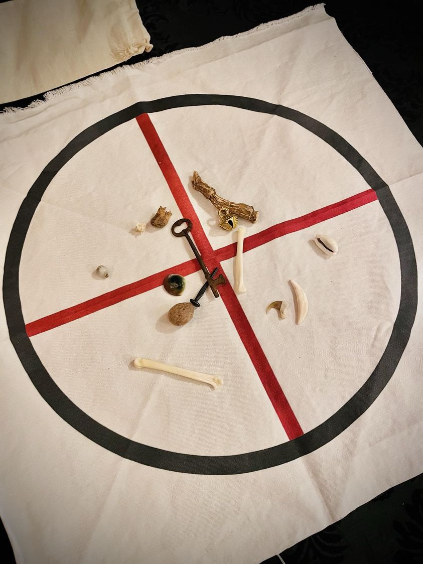 This 13-piece bone throwing kit includes a variety of bones, roots and curios. It comes in a cotton carrying bag and includes a printed cotton mat which may be customized with your own dyes, markings or sigils.