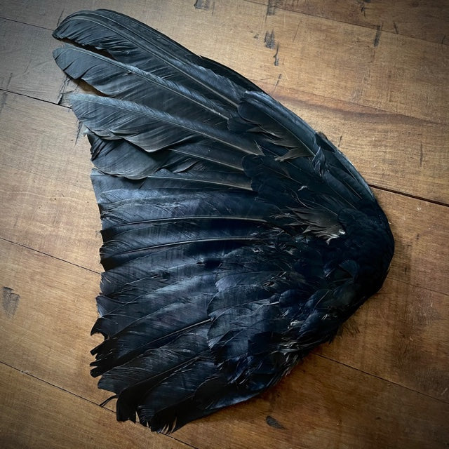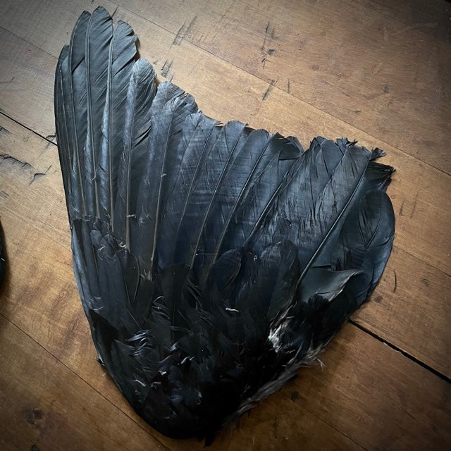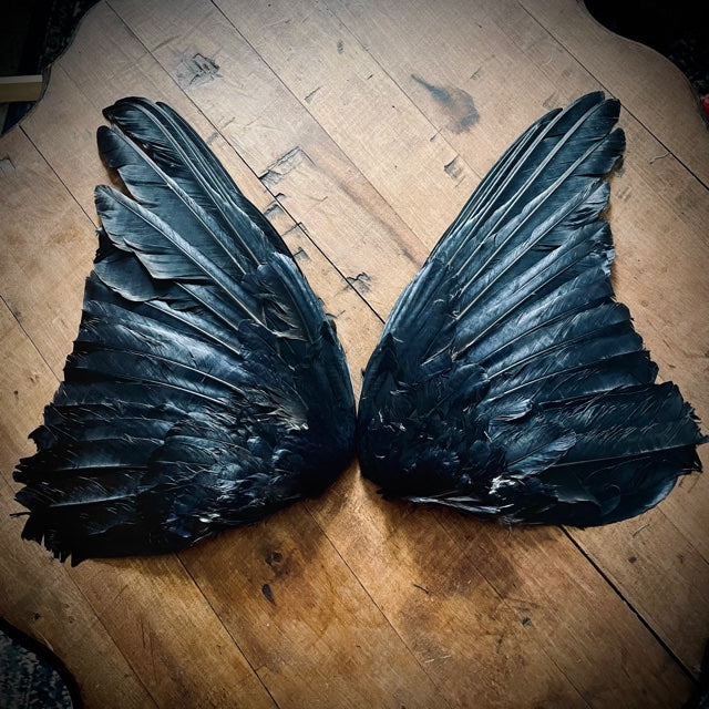 These wings are the byproduct of crow hunting seasons which occur in rural areas of the U.K. in order to keep populations down and preserve agriculture. We feel it is only fitting that they not go to waste and instead find a home with those who will honor and exalt the spirit of the crow.
