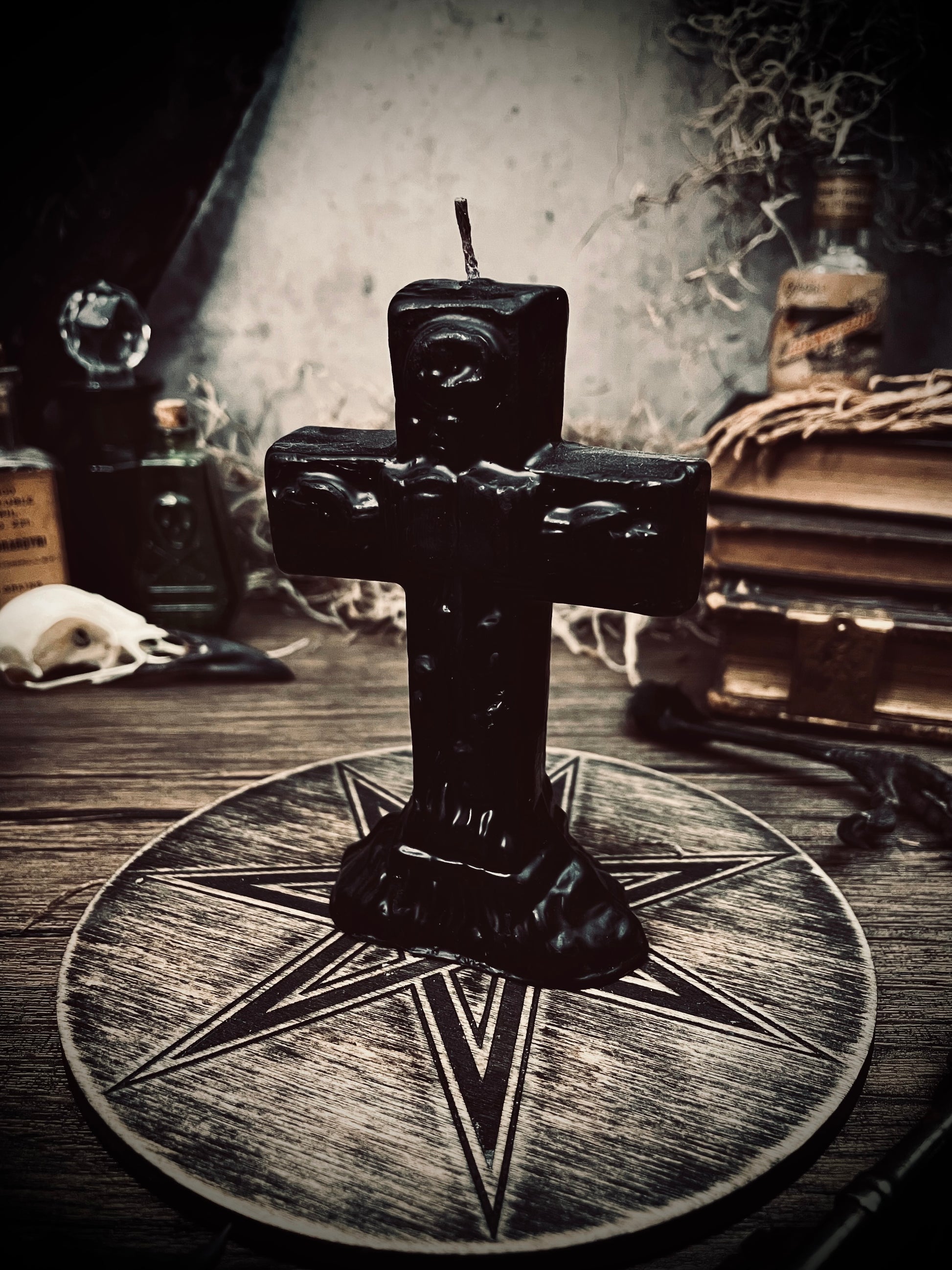 Cross candles are often used as general altar candles. The popular image represents the Christian cross with an open bible at its center. Though primarily used by folks who are Christian, some practitioners use the candles as representative of the crossroads. They are also used by many in works of devotional prayer and various works dependent upon color. White for faith, purity and uncrossing. Black for personal power and occult wisdom. Green for money matters. Red for love and matters of the heart.
