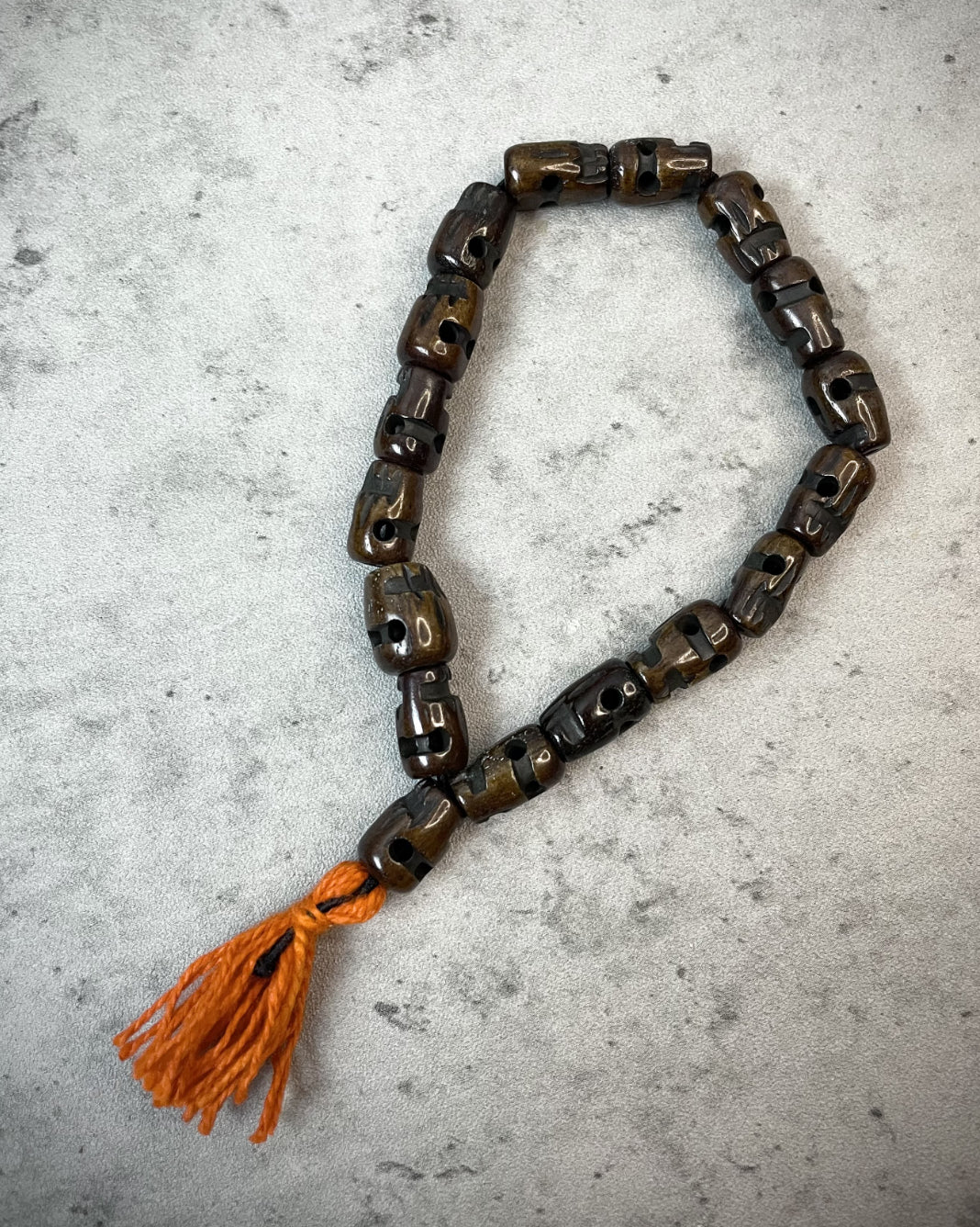 Dark handcarved bone skull beads strung into a stretch bracelet with elastic cord and tassel. Inspired by the Buddhist tradition, skull beads are a reminder of the impermanence of life.