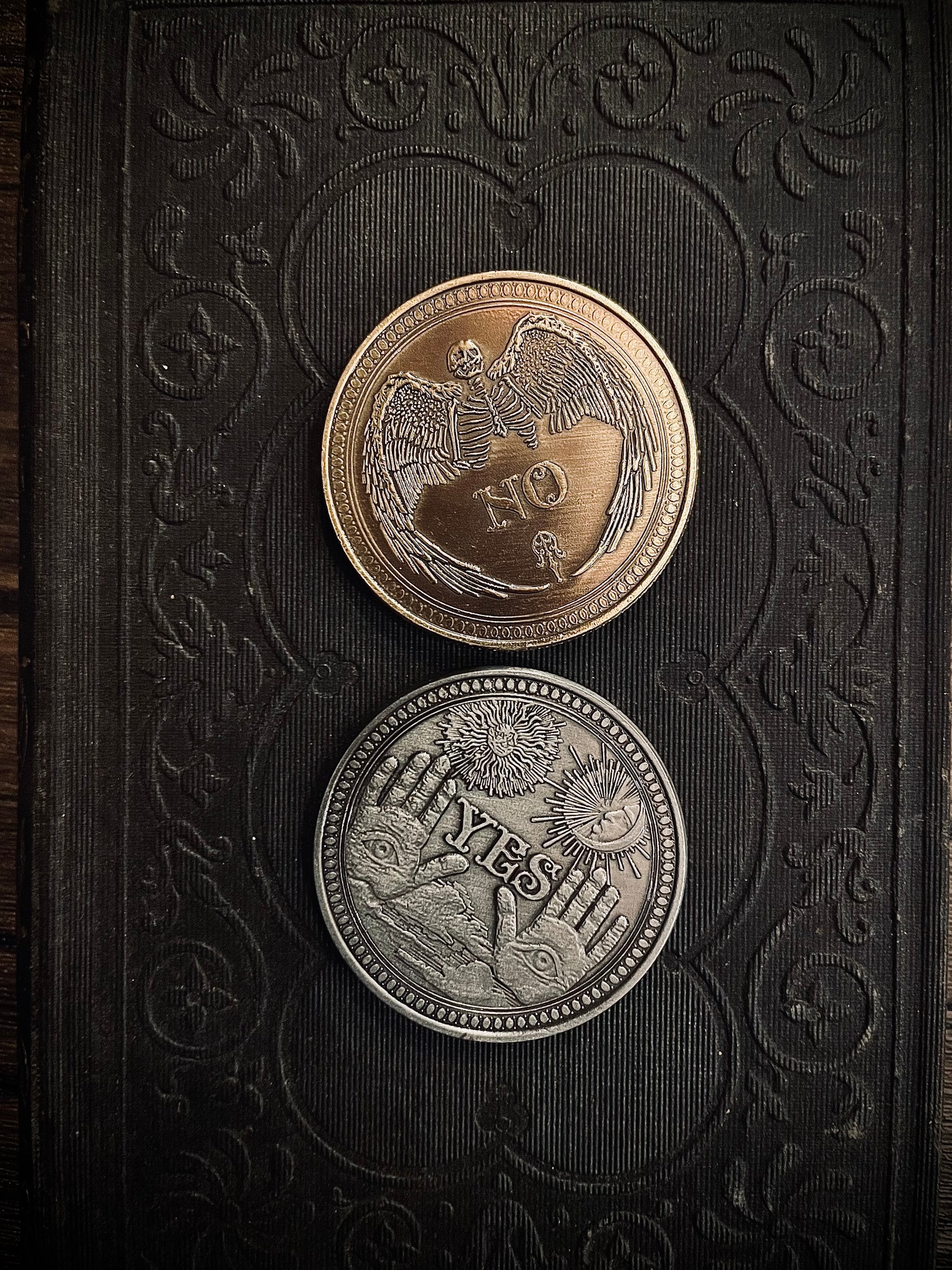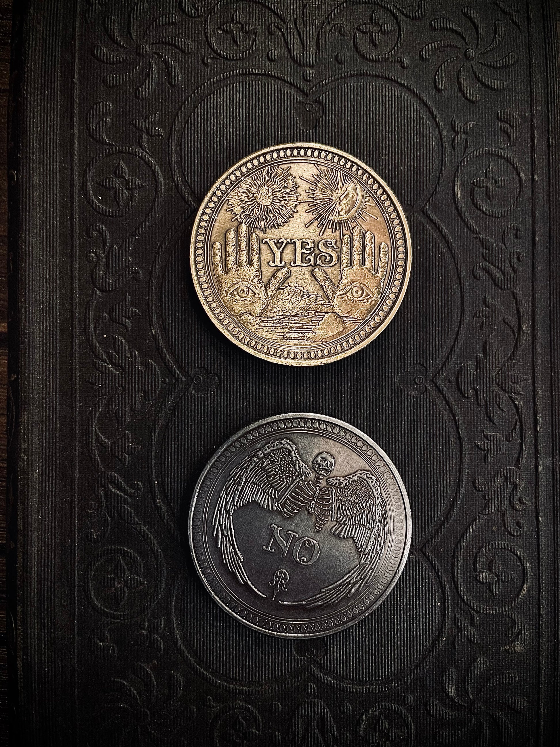 These oversized gold and silver divination coins are useful when you need the clarity of a simple "yes" or "no." They are embossed with esoteric designs and have a satisfying weight to them.