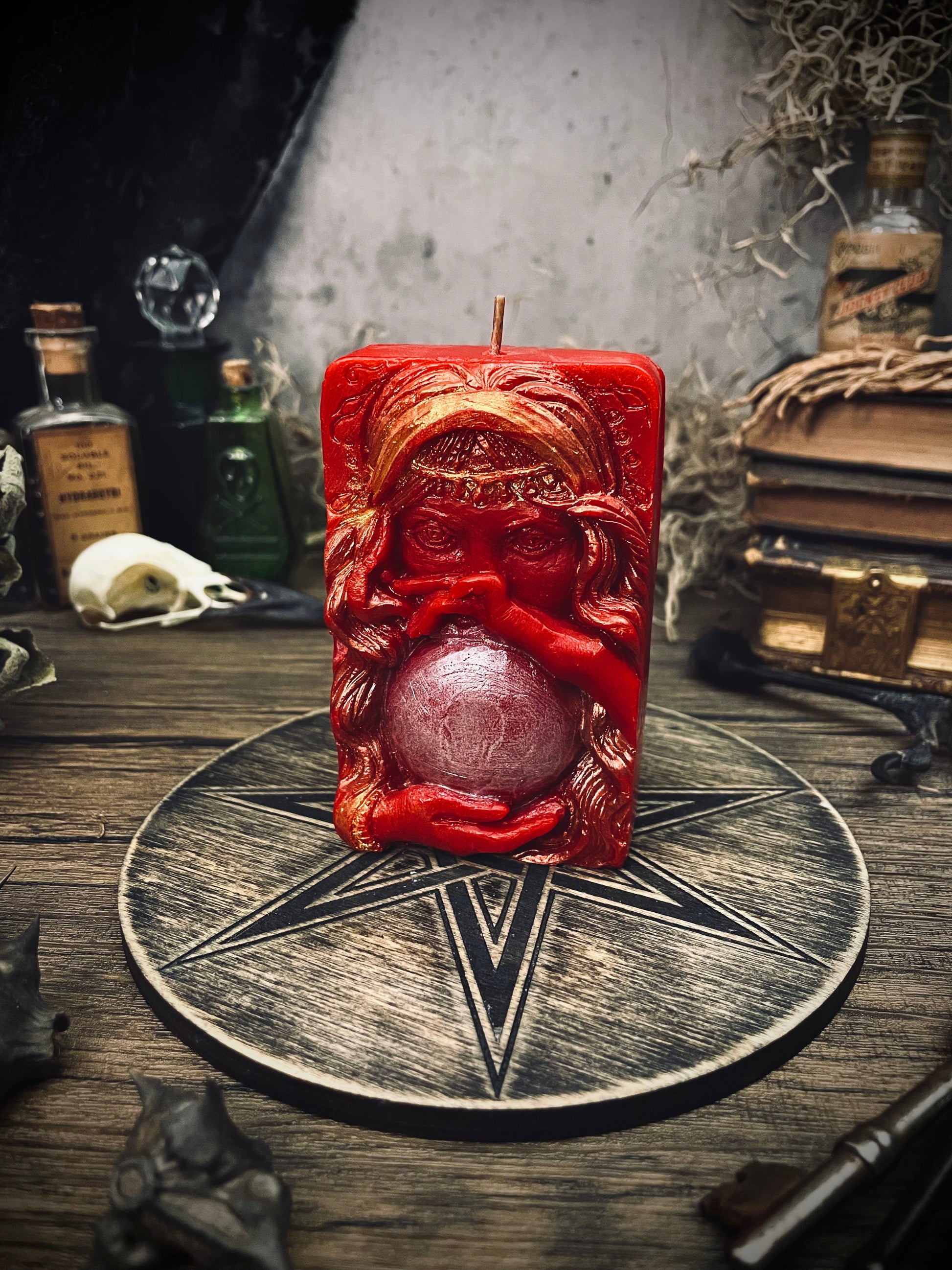 This intricately detailed candle is enhanced with details of gold and silver mica and depicts a seer pondering her crystal ball.