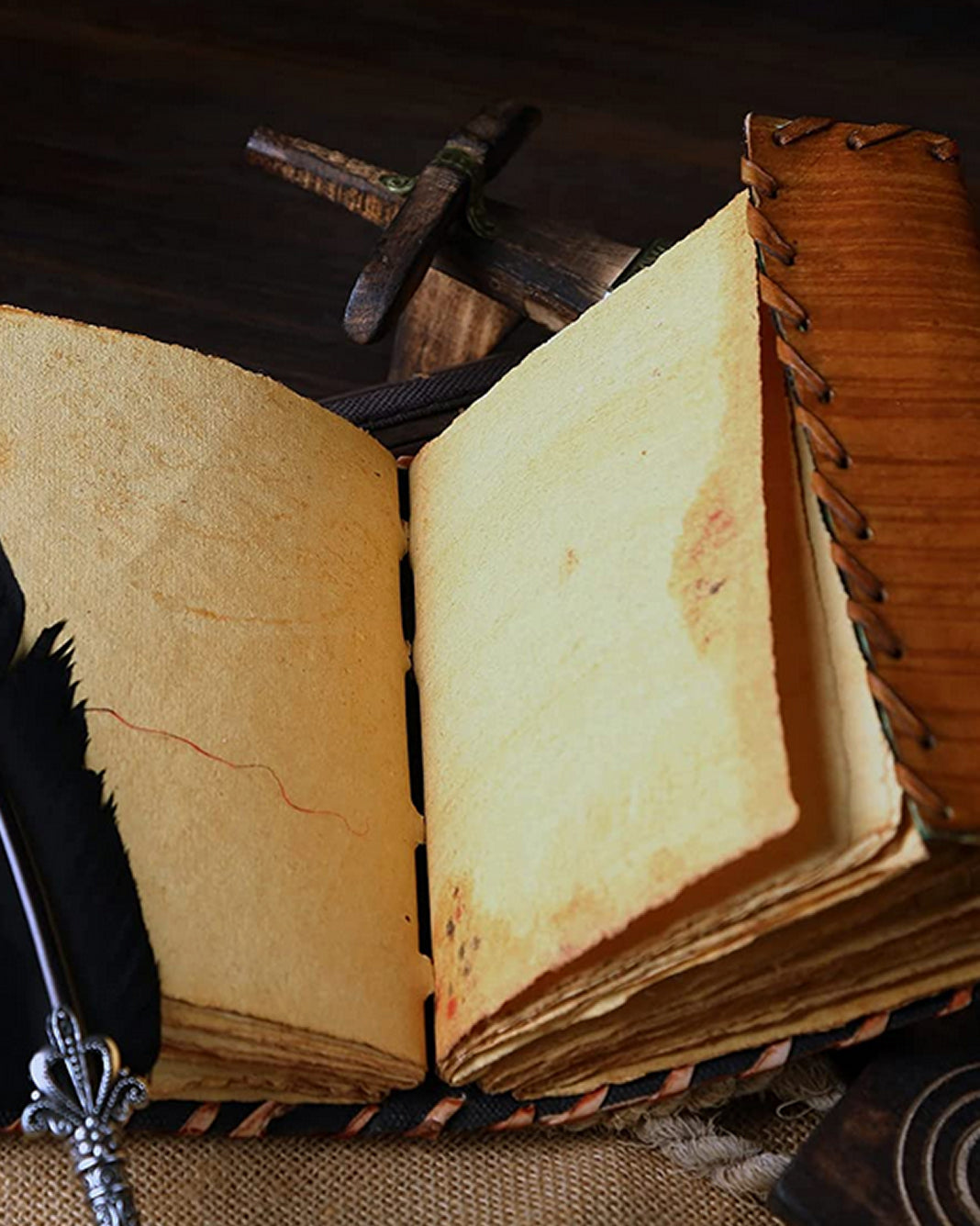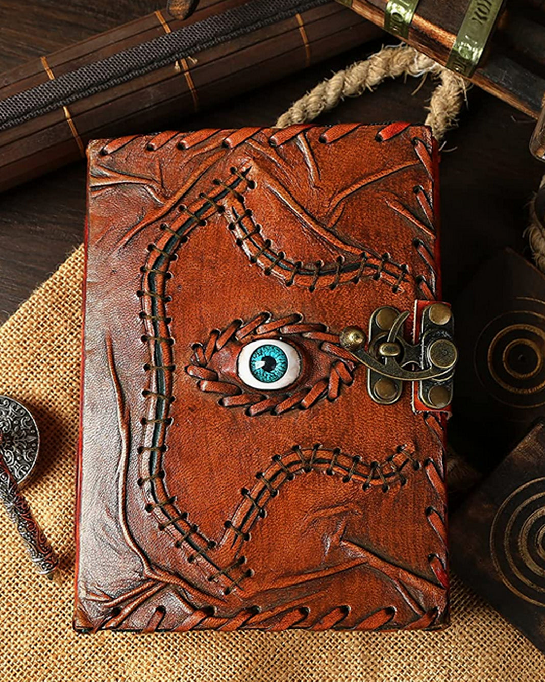 This 5x7" leather journal recreates the famous witches' spellbook from Hocus Pocus with Frankensteinian stitching and a staring glass eye. It has a vintage-styled metal latch and 200 blank pages of 120 gsm antiqued paper with deckled edges.