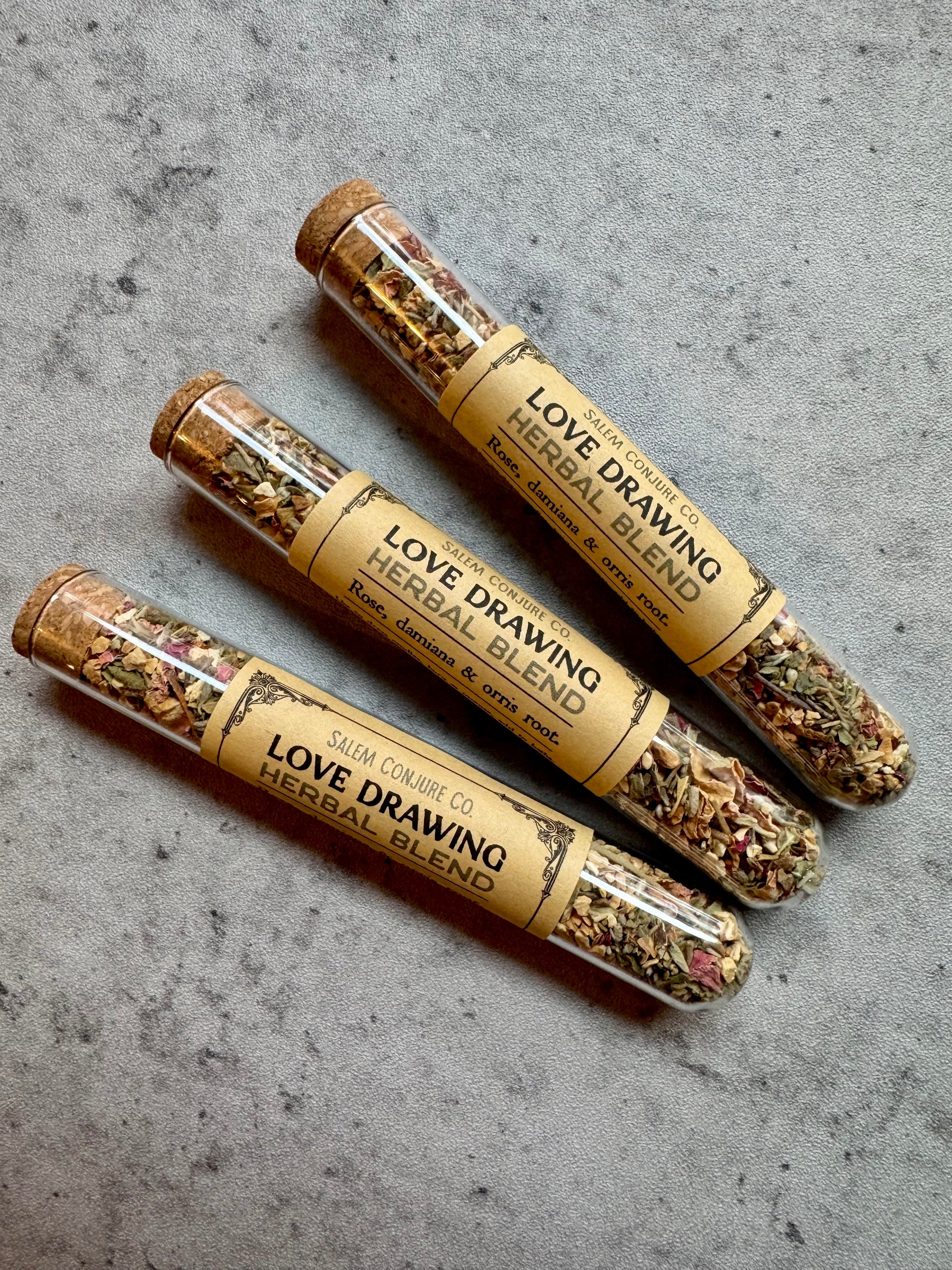 This blend of herbs is formulated to draw in love in all its forms. It includes rose for affection and loyalty, damiana for sensuality and lust, and orris for attraction. It combines well with any of our love drawing condition oils including Love Drawing, Cleopatra, Come To Me and Follow Me, Boy! and can be worked with red and pink candles.