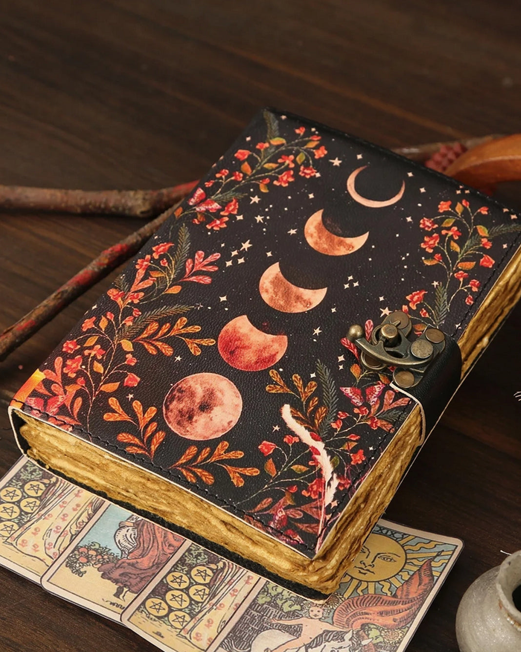 This 5x7" leather journal has a vintage-styled metal latch and 200 blank pages of 120 gsm antiqued paper with deckled edges. Perfect as a dream or moonphase journal, or for magical musings.