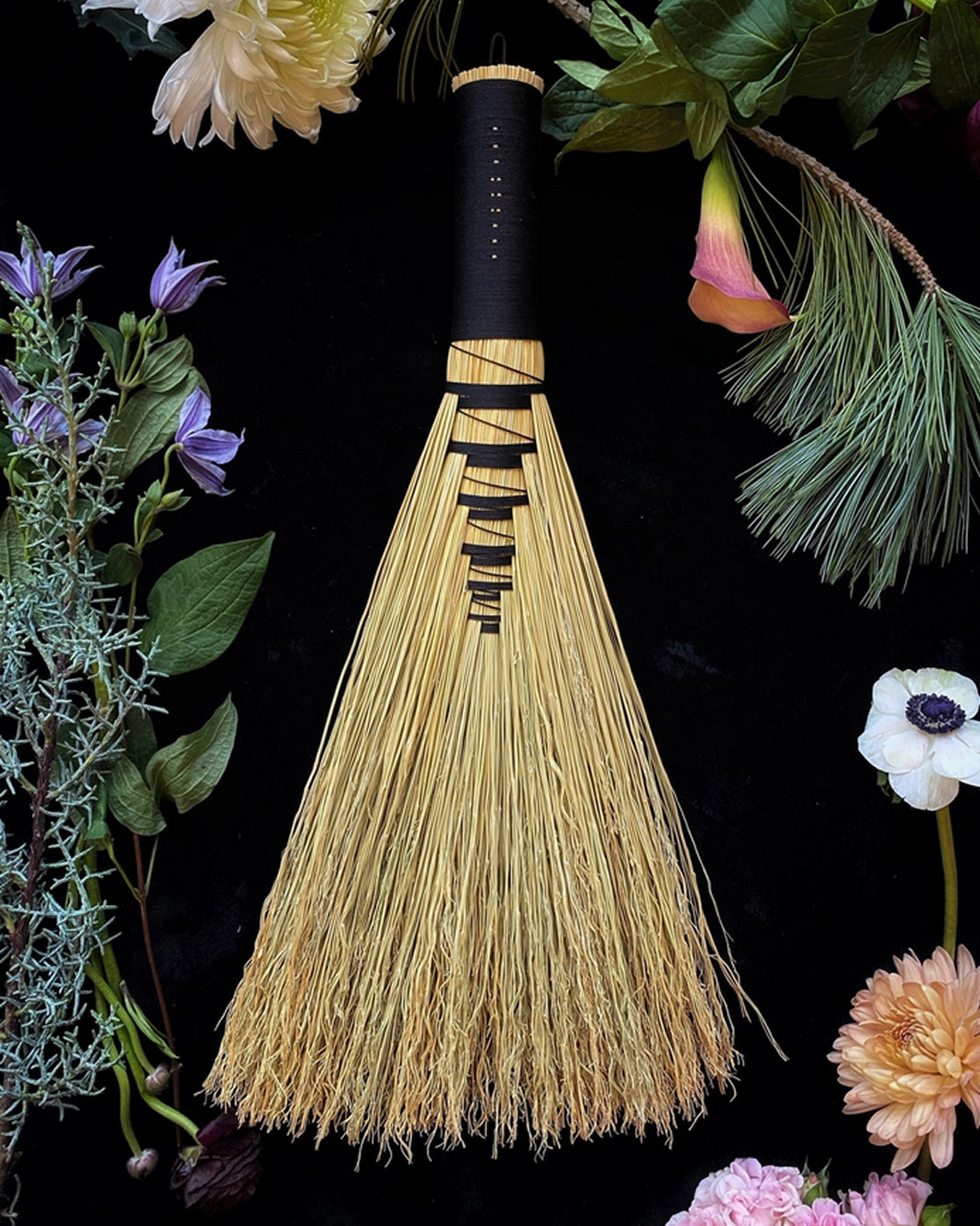 These specialty hand wisk brooms are one of a kind. We hand-dye all of our broomcorn and lovingly stitch and adorn them with special details. Sizes of brooms vary but are made w/ 20-22” broomcorn and have a full fan approx 10-12” wide.