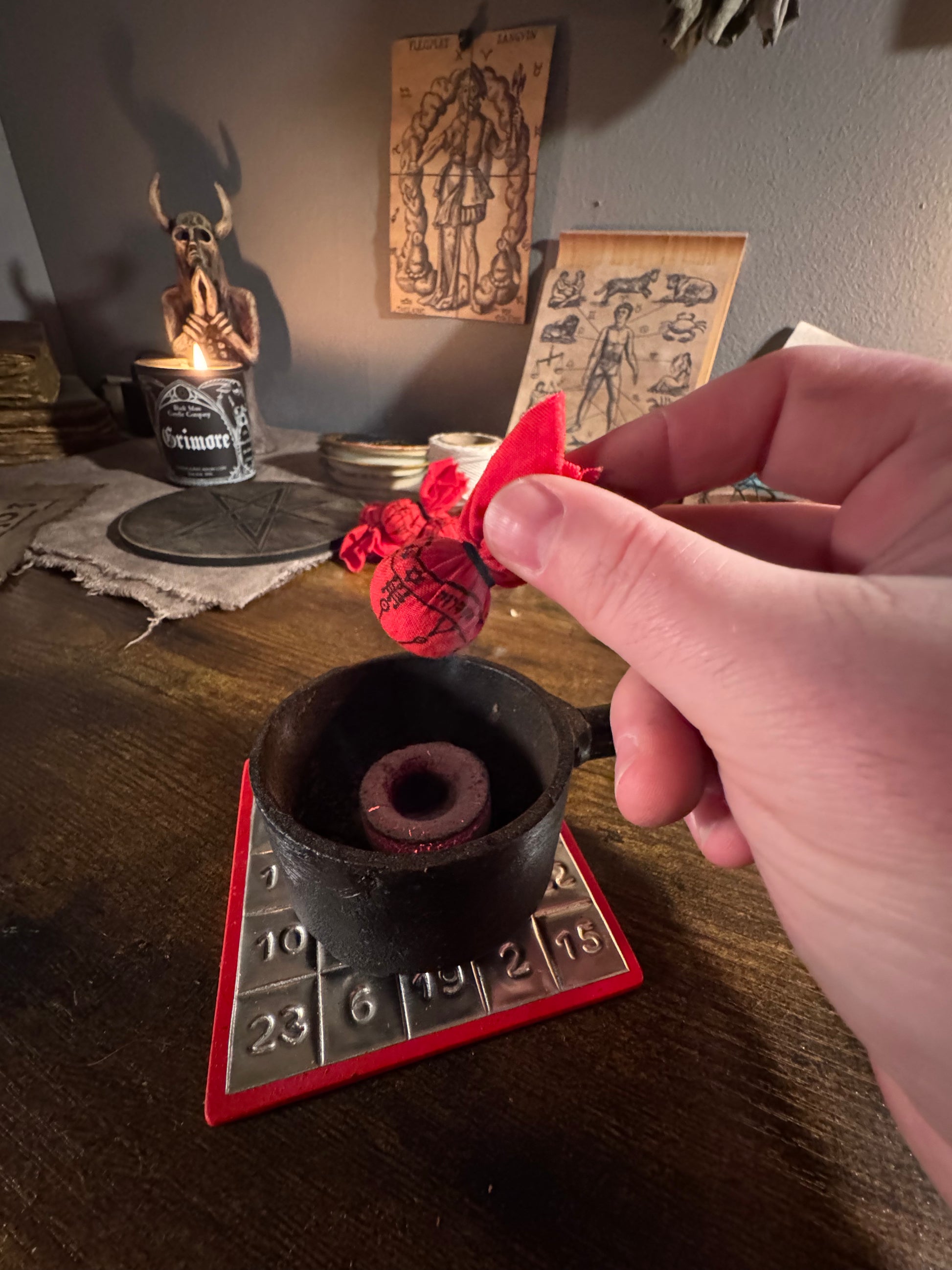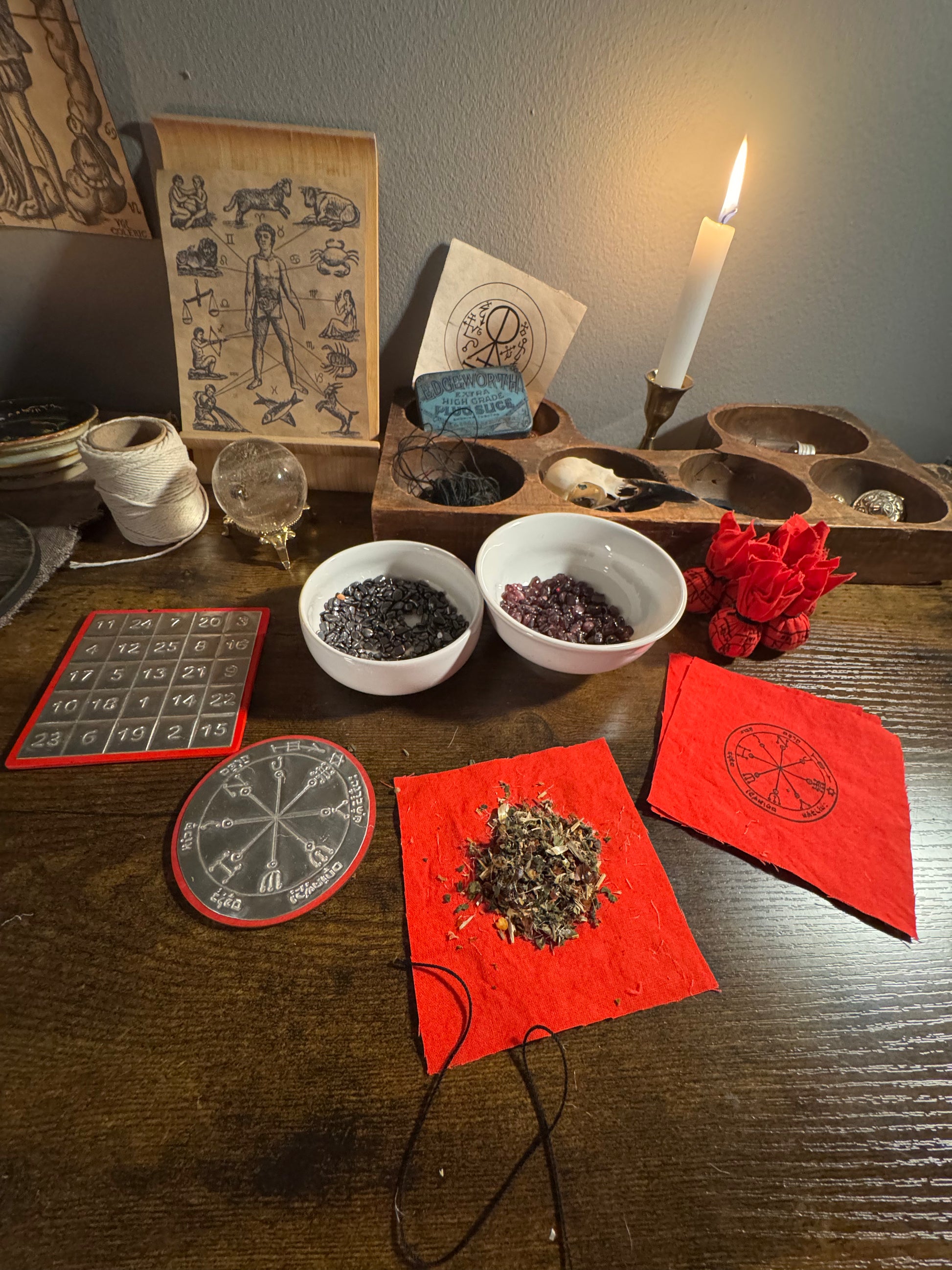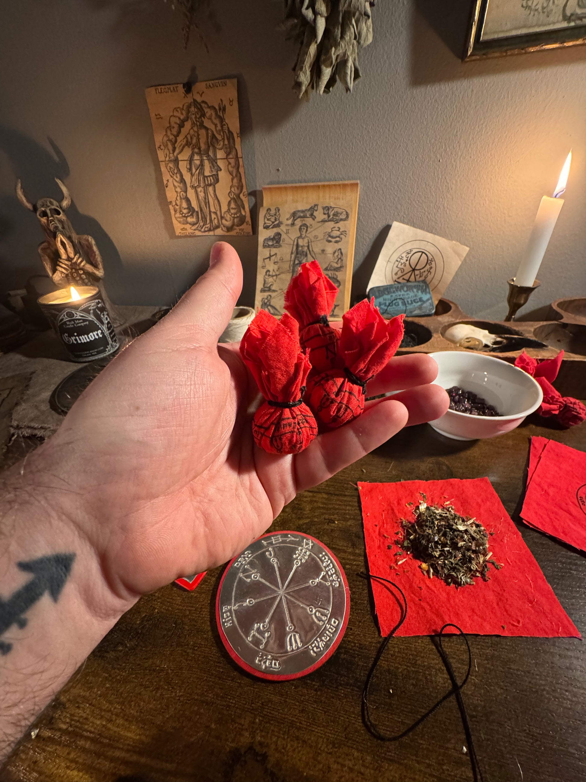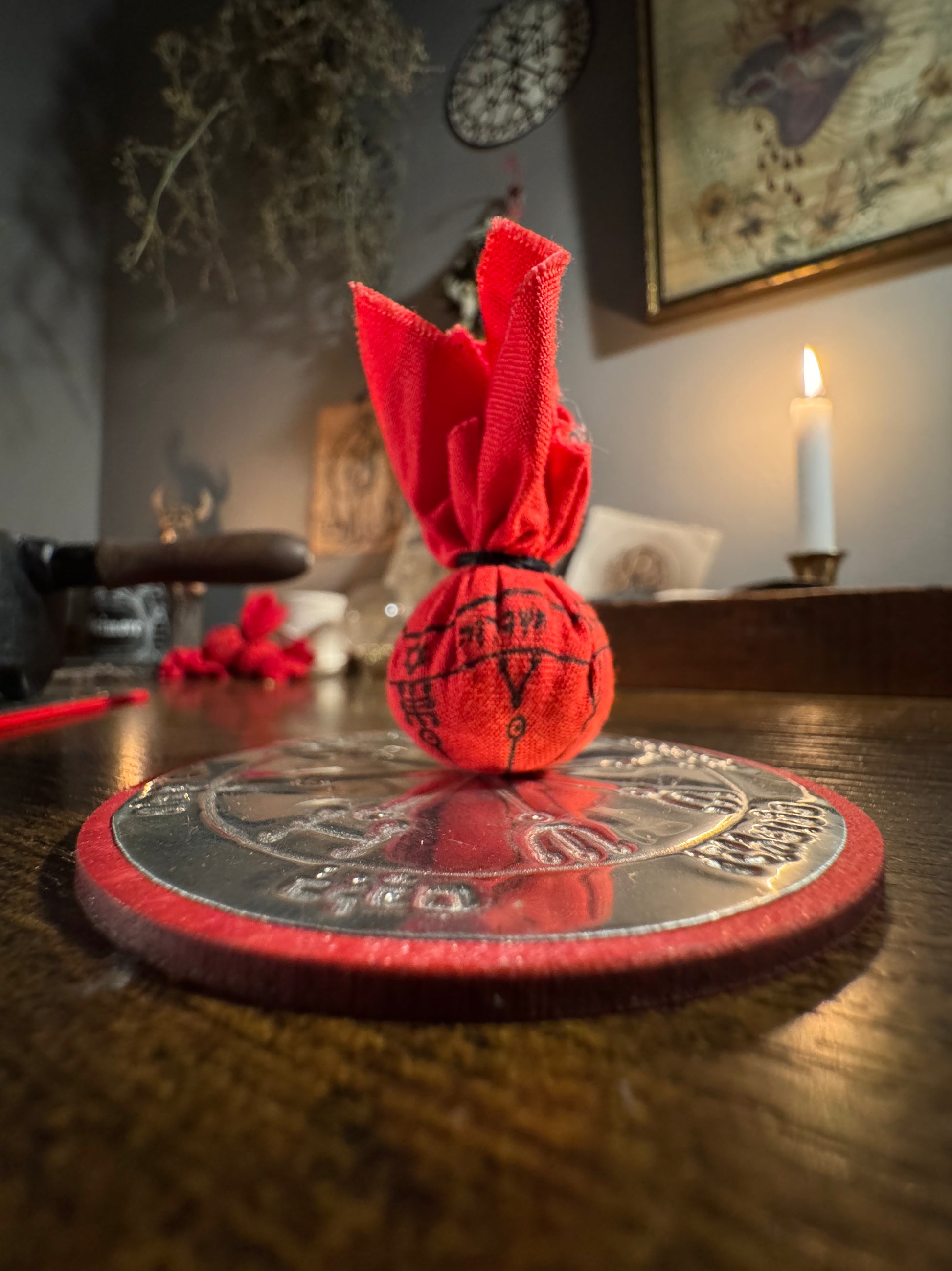 These conjure bags are amulets of heavy protection and defense. Crafted in the day and hour of Mars and calling upon the virtues of martial botanicals and minerals.
