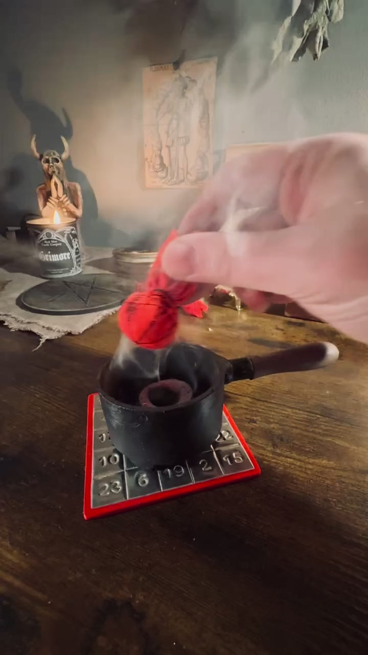 The fabric of the conjure bags is emblazoned with this pentacle and has been infused with a wash of Martial herbs. The conjure bags have been made in allyship with Stinging Nettle, Blessed Thistle, Red Pepper, Hematite, and Garnet. They were blessed and suffumigated in the smoke of Dragon’s Blood whilst martial hymns and conjurations were spoken.