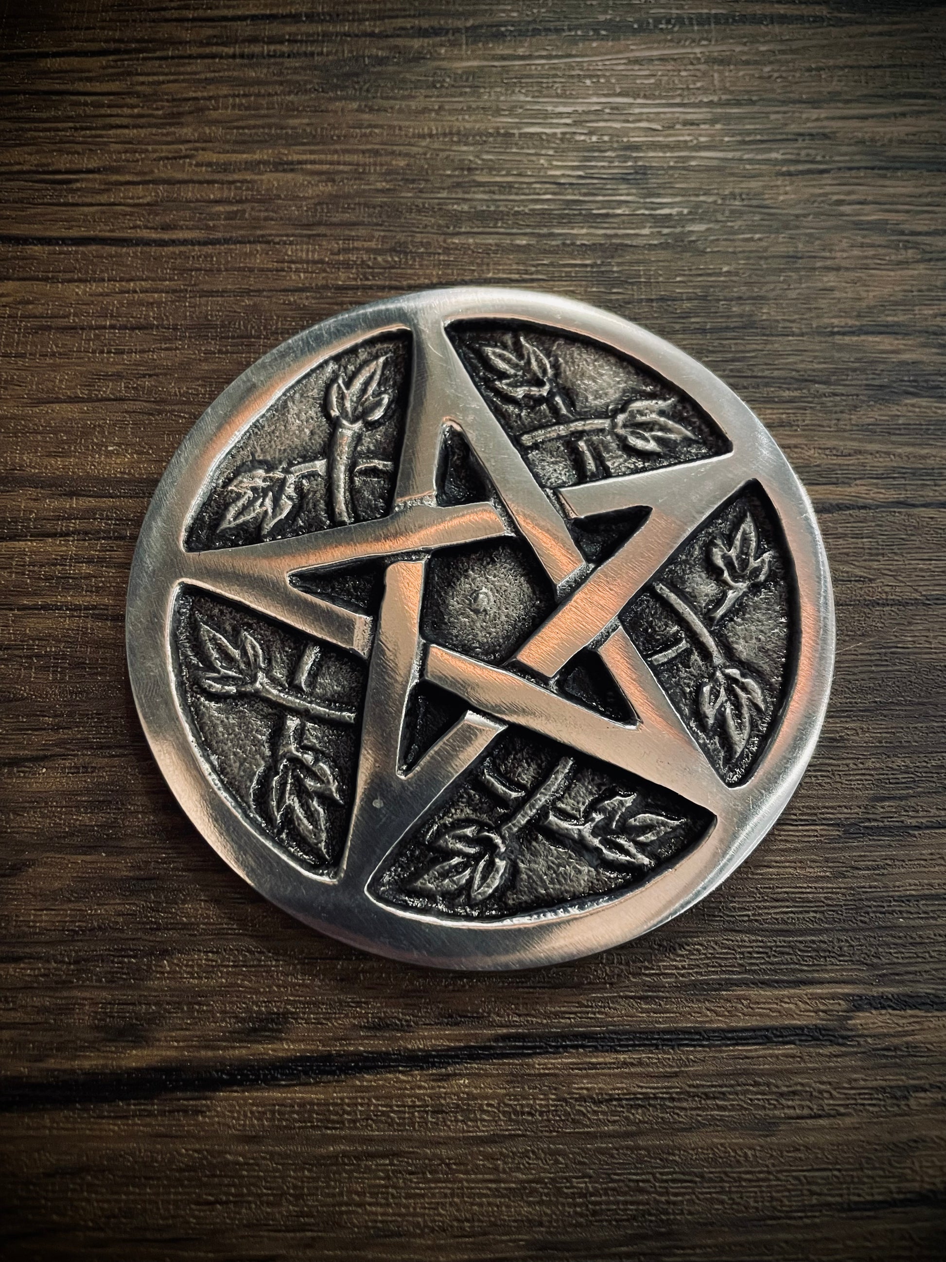 This silver alter paten is cast in the design of a pentagram encircled by twining vines.