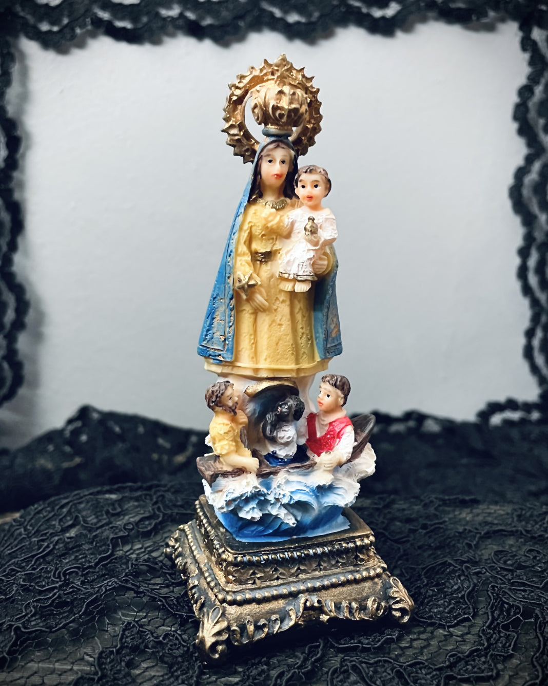 The Caridad del Cobre is the Virgin of Charity whose holy image appeared to three brothers caught in a storm of the coast of El Cobre, Cuba. After praying to the Virgin, the storm calmed, and they found a statue of the Virgin, miraculously dry, floating in the sea.