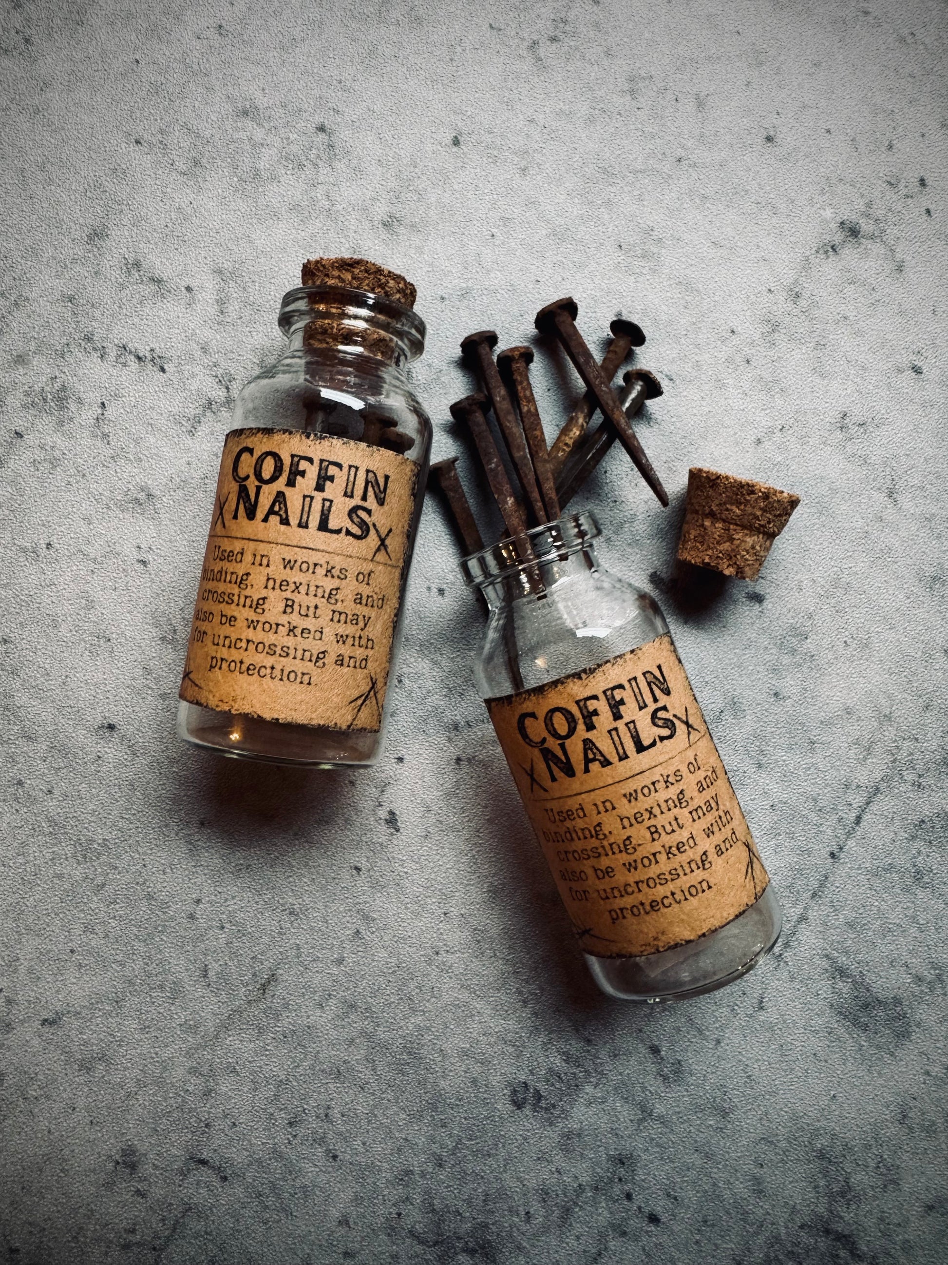 Traditionally true coffin nails were nails that come from a coffin. As these are increasingly difficult to come by and would be prohibitively expensive, we are proud to offer the next best thing. Our coffin nails are antique nails that have been ritually interred in grave dirt and ritually prepared.