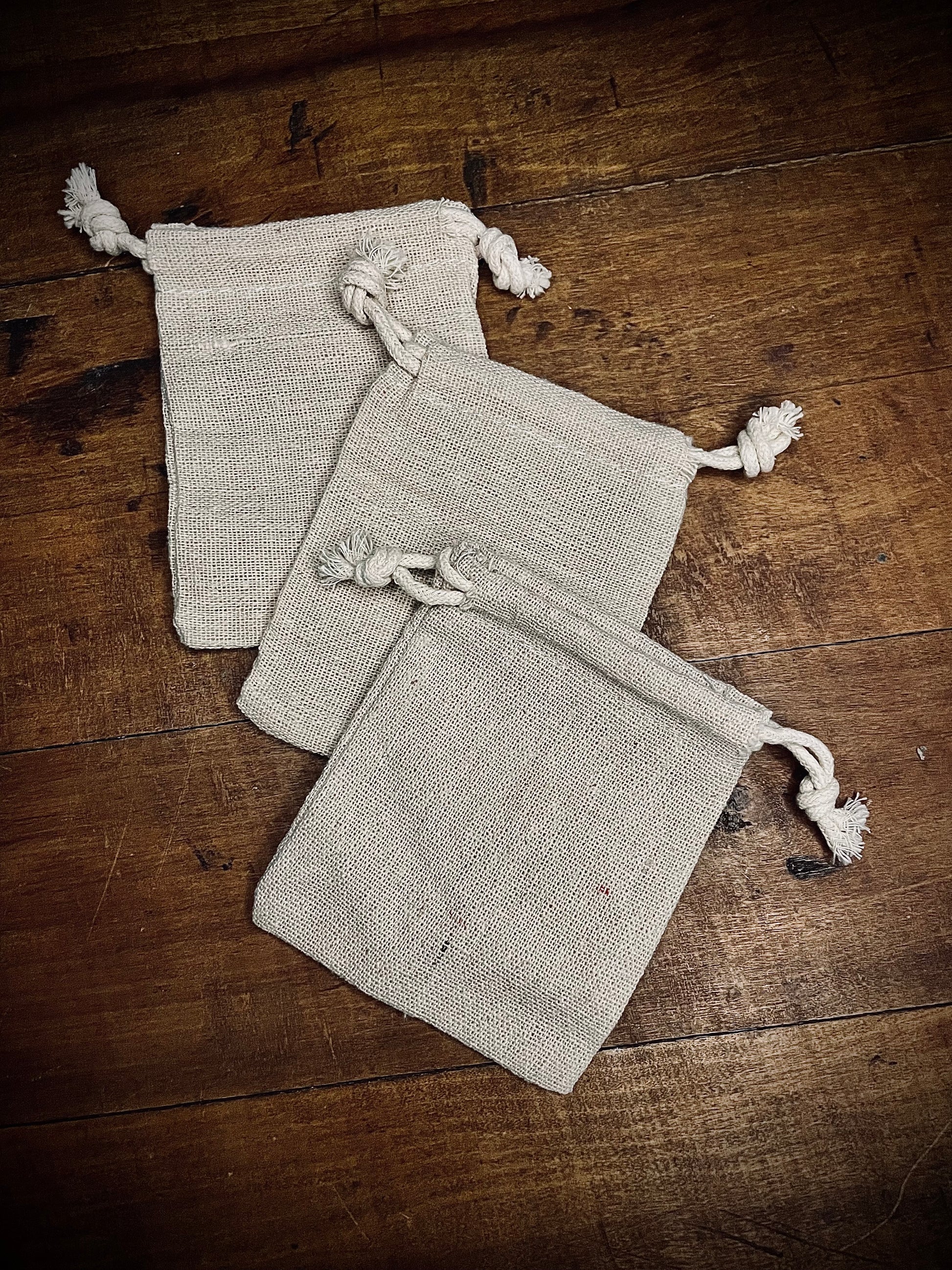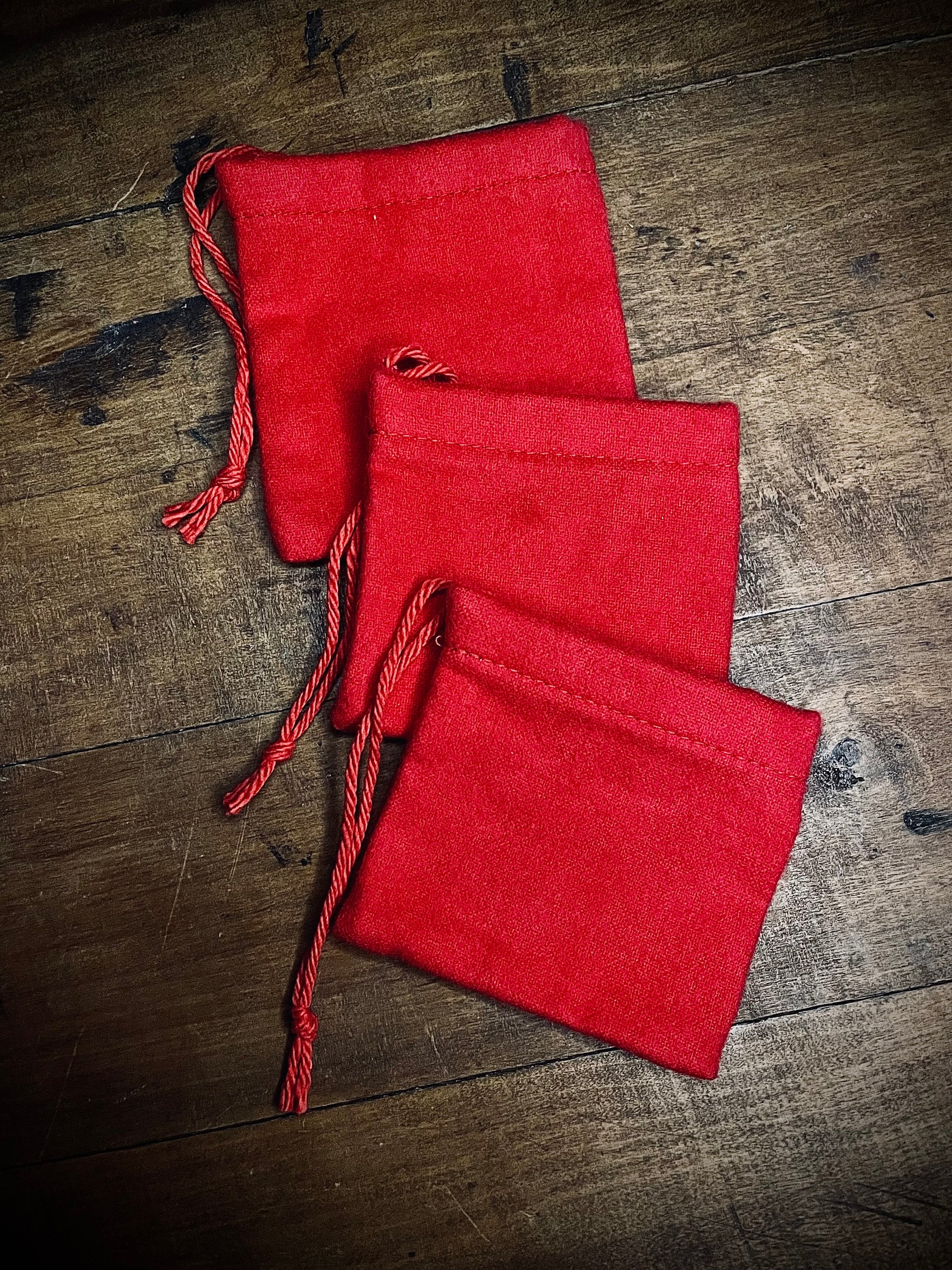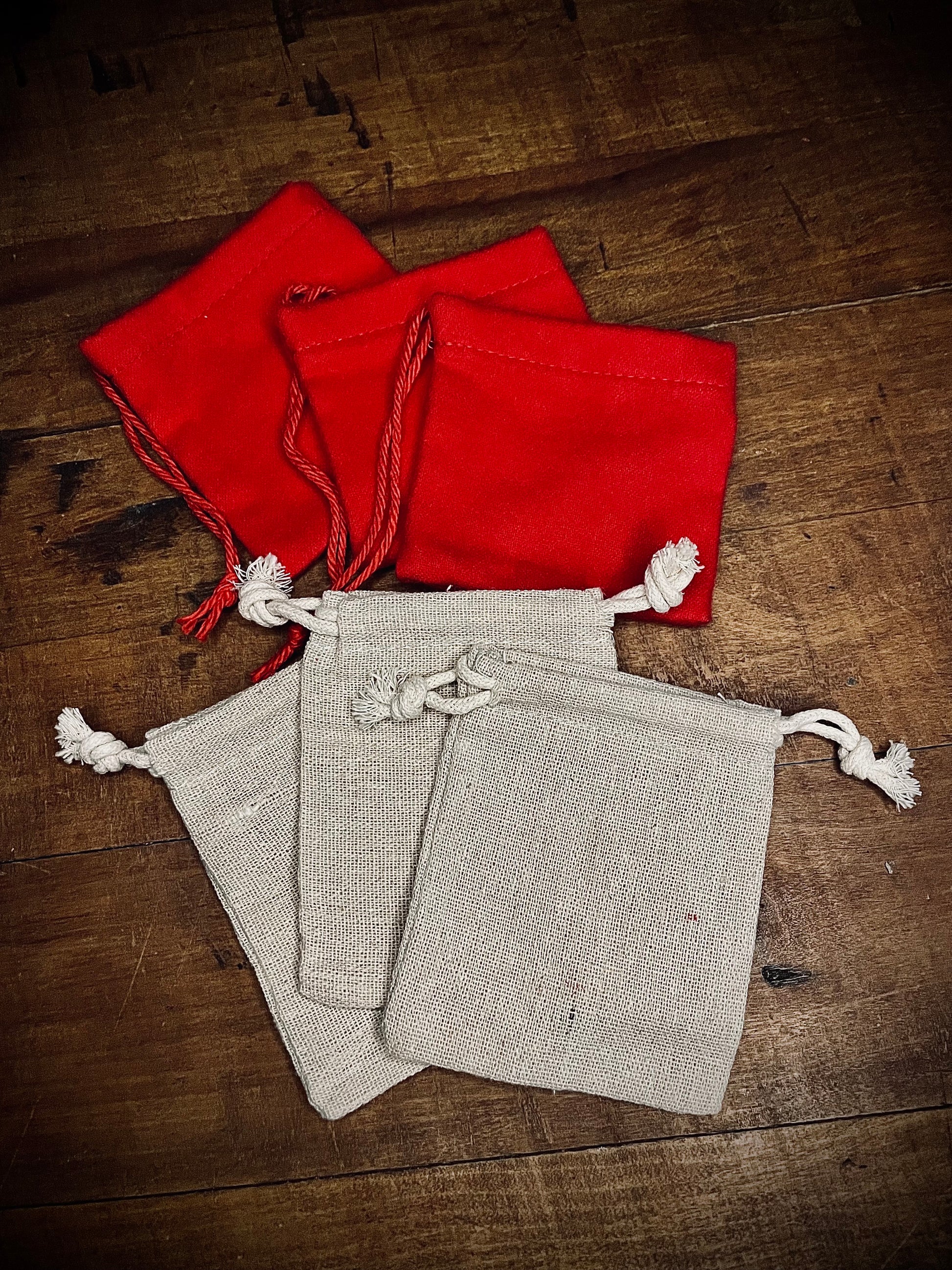 Traditional red flannel and natural white cotton bags used for the safe carrying of magical curios and for the crafting charm bags and mojos.