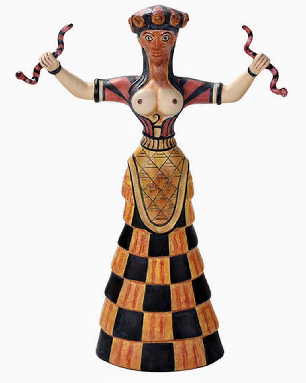 This reproduction of the mysterious Snake Goddess statue from the palace at Knossos in Crete stands almost 11" tall.