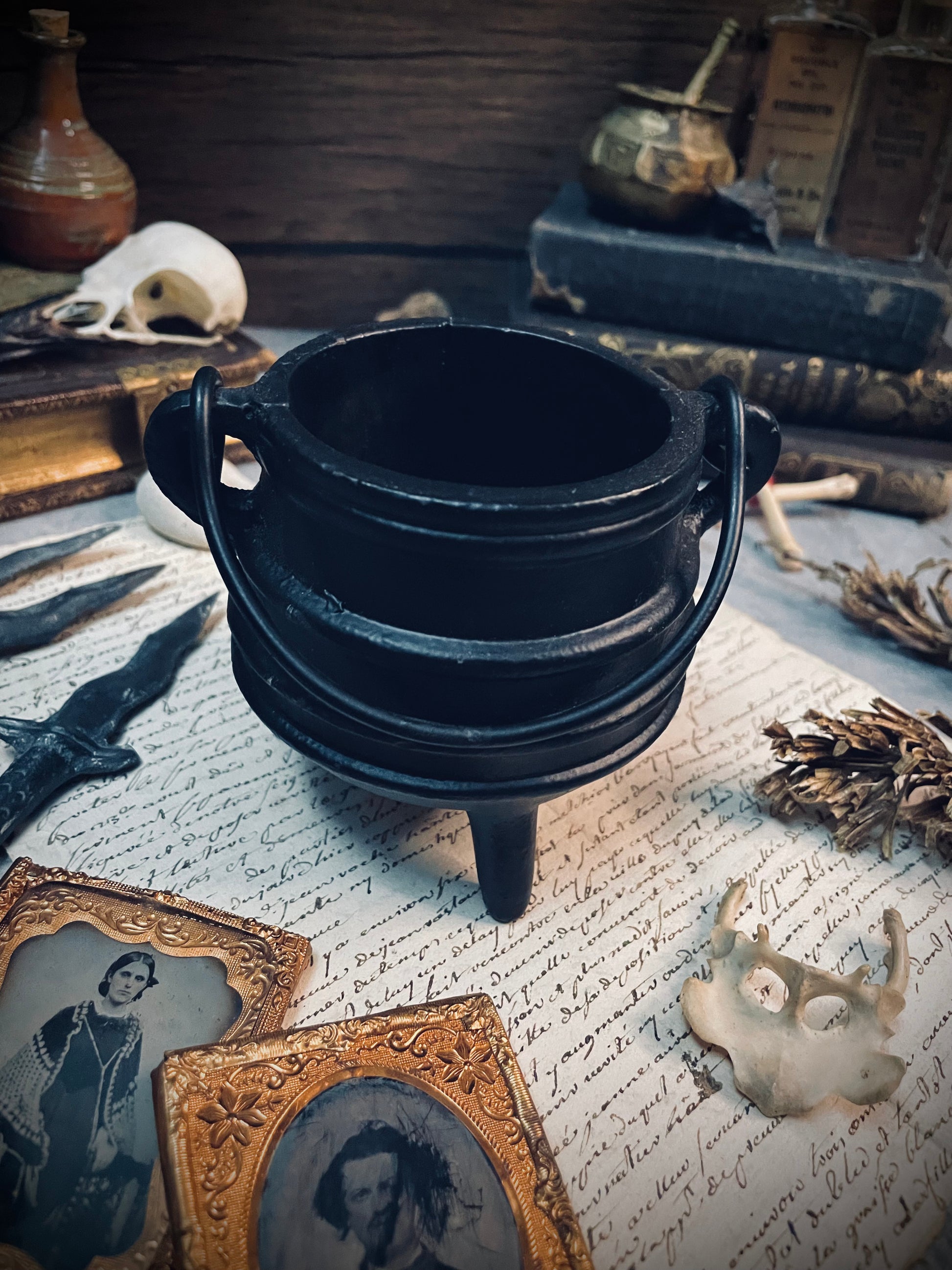 This stout tripod cauldron has a series of horizontal ribs climbing its sides, and tapers slightly towards the top. Includes lid and a wire-loop handle.