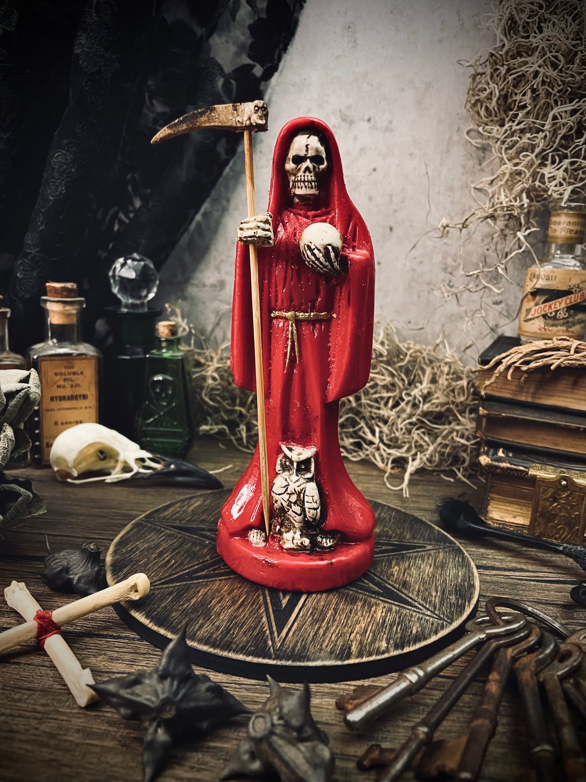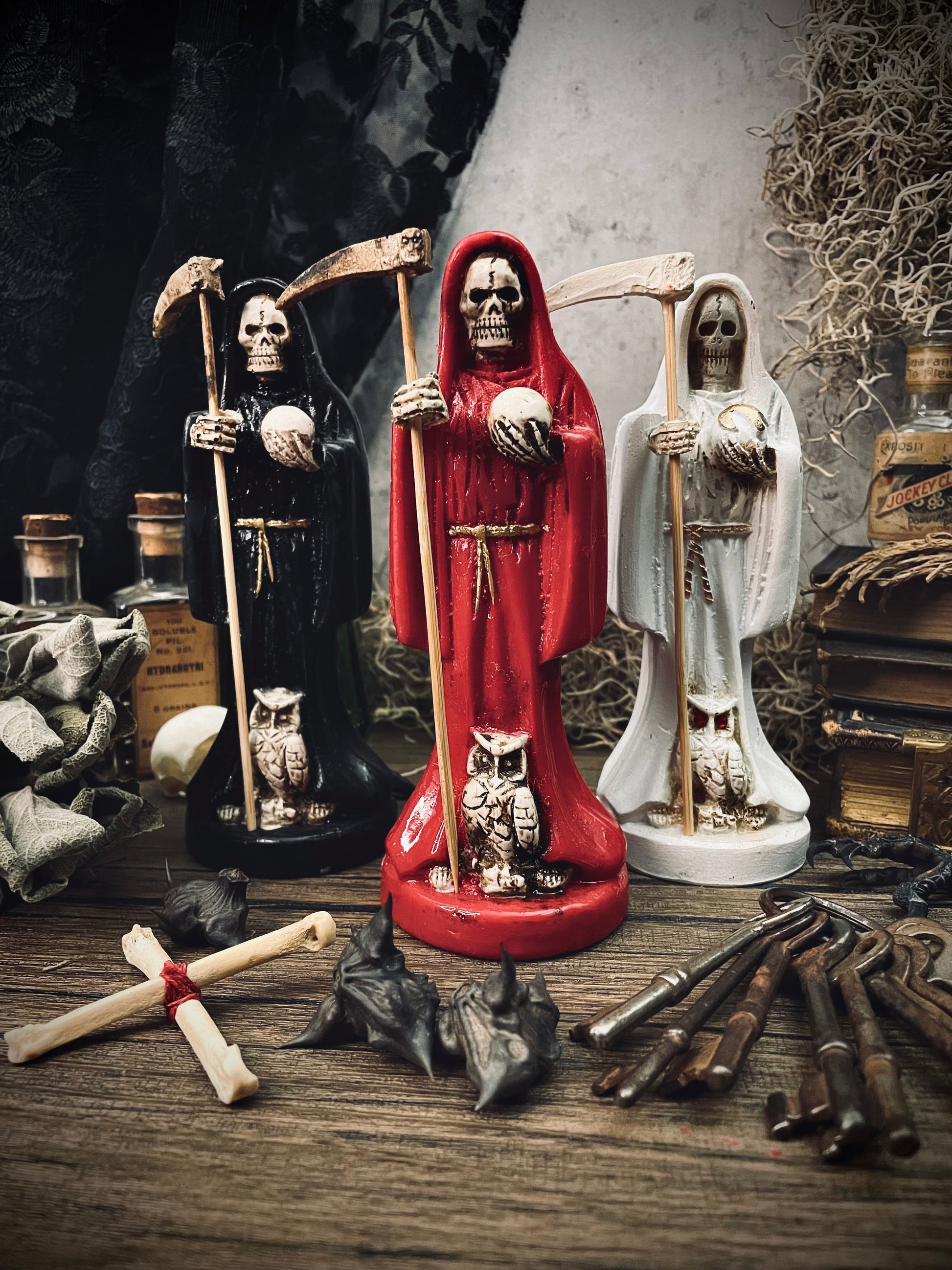 Black and Red Santa Muerte statues depict her wearing a red cloak over a black robe, and are used for powerful reversal magic, with the red and black reflecting her twin powers of protection and domination. With the representation of white bone and the black and red robes this statue may also be worked with to represent the White, Red, and Black robes of La Muerte combined.