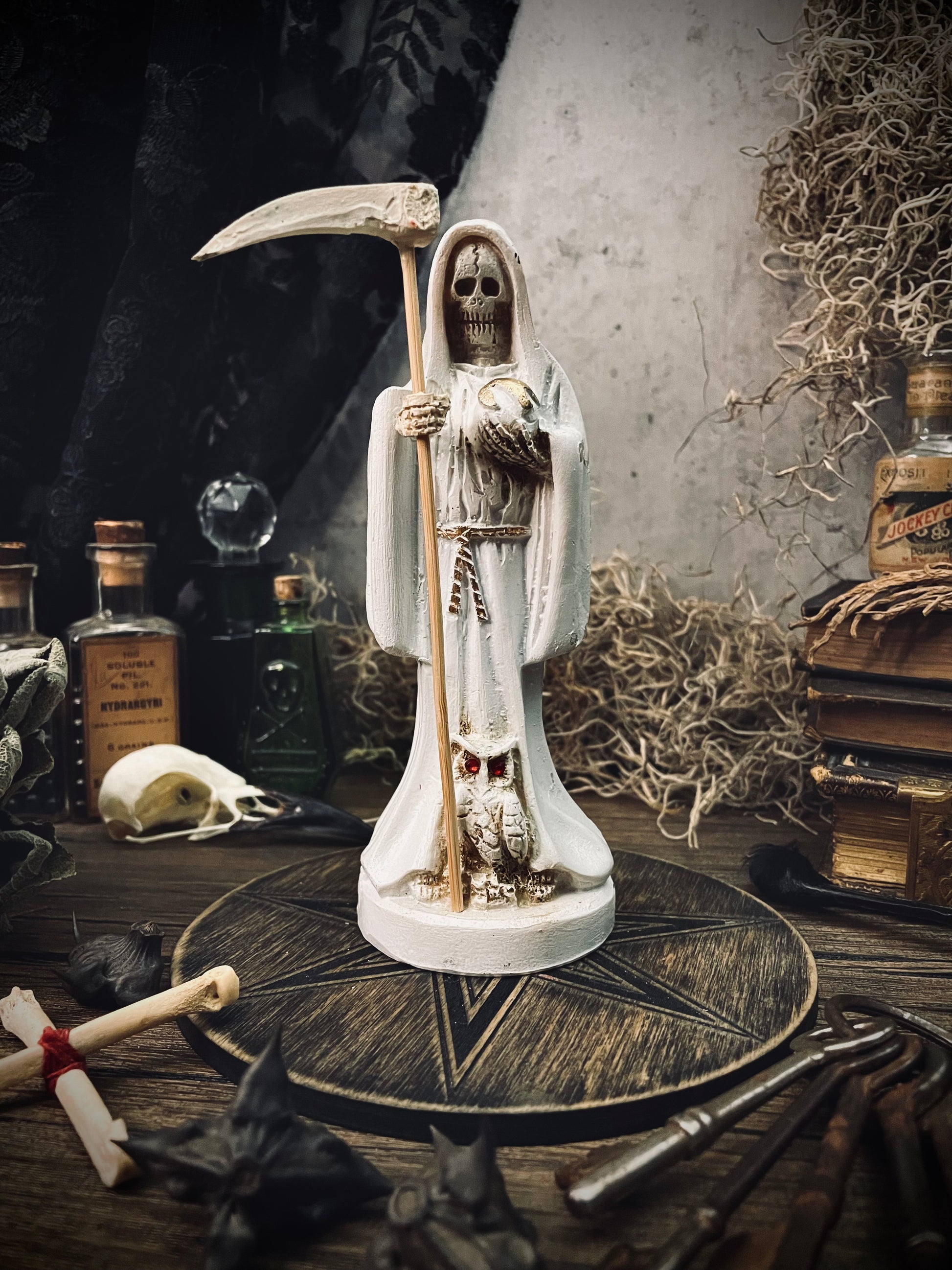 Bone, or natural, Santa Muerte statues are commonly worked with in ancestral and death workings, and also called upon for healing.