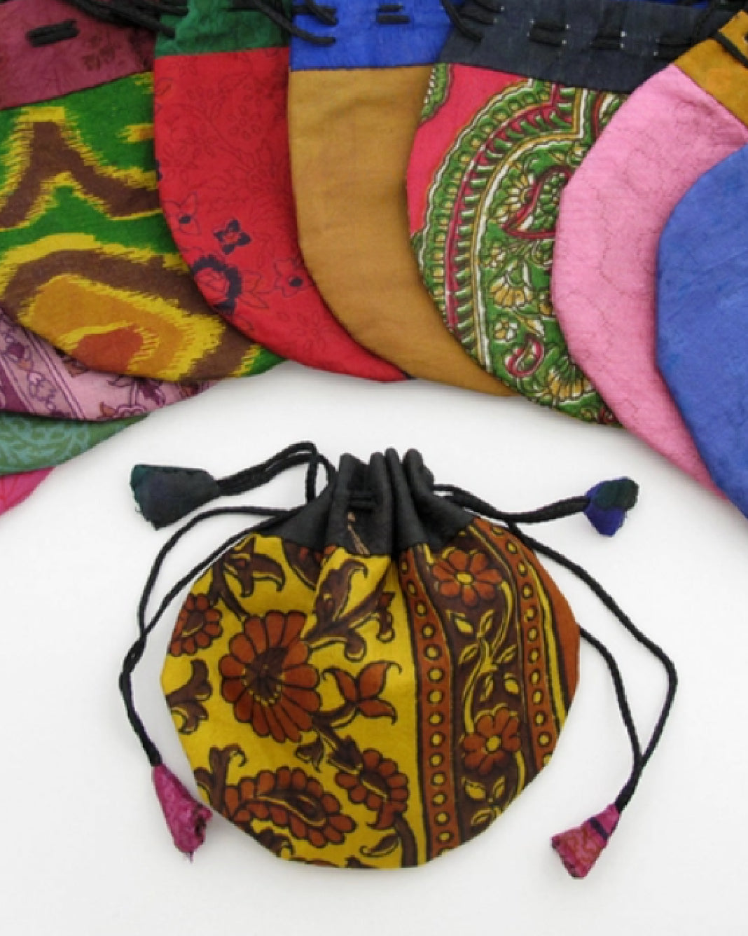 These colorful pouches are made of recycled silk saris. One set of drawstrings closes the pouch tightly, while pulling the other set opens it. Use as a change purse or to store jewelry and other treasures.