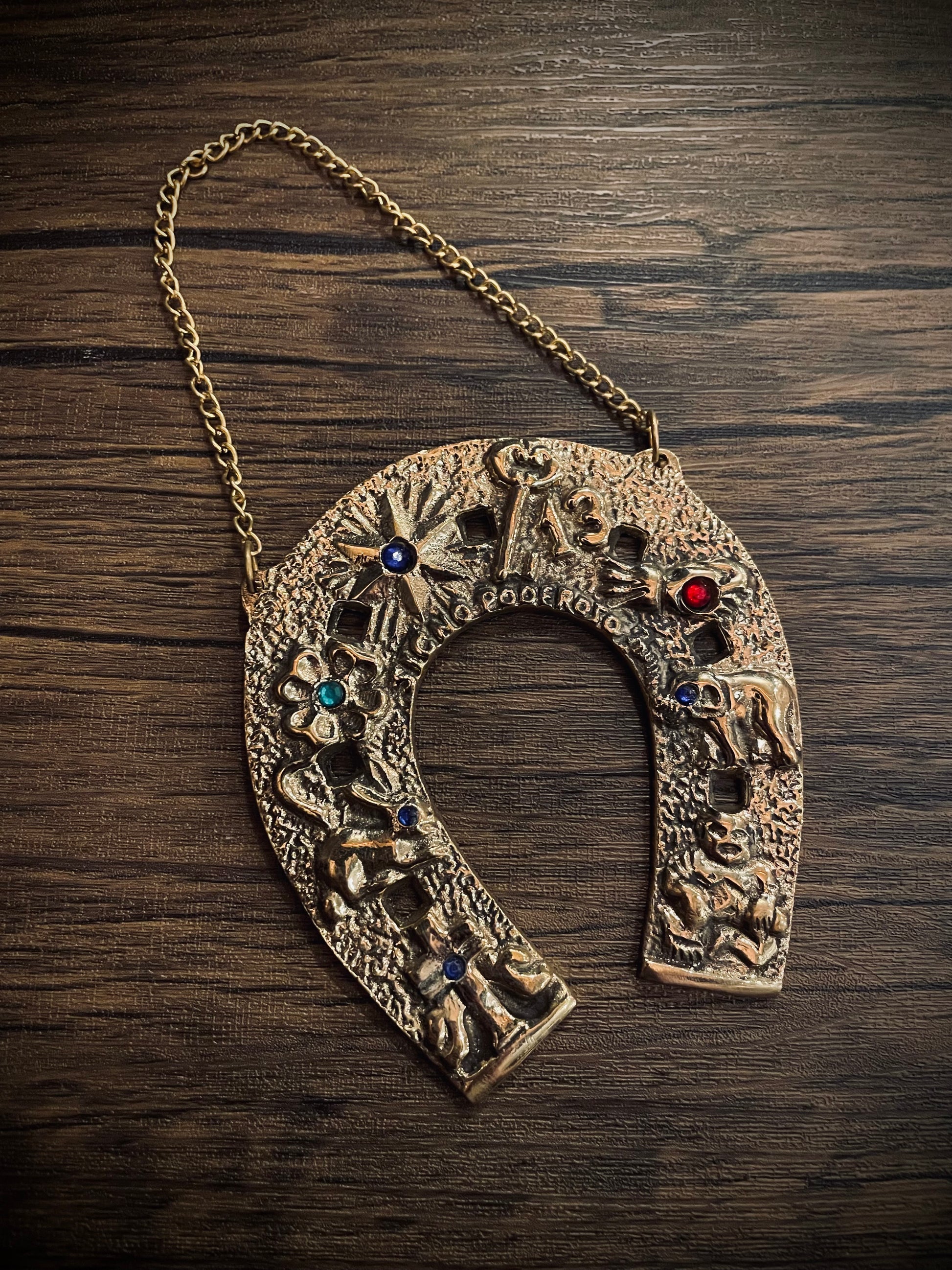 This golden horseshoe draws upon the legend of the Cross of Caravaca. It is set with colored gems and engraved with the words Signo poderoso and lucky symbols including a rabbit, the number 13, a clover and the Cross of Caravaca itself.