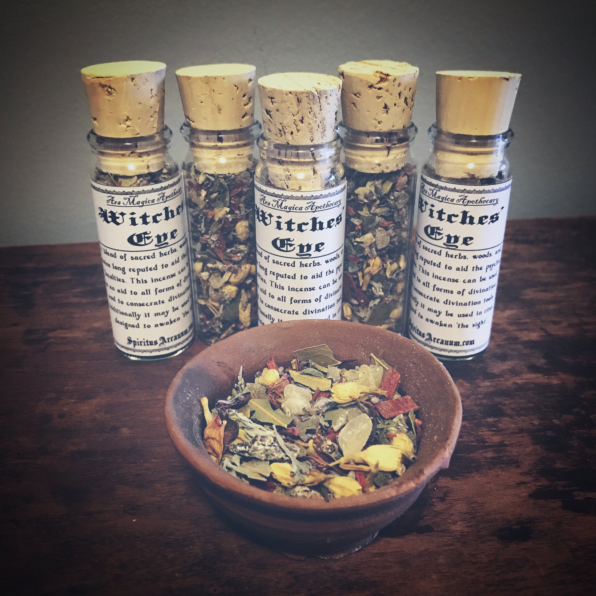 Our Witches’ Eye incense is a gathering of varied herbs, resins, and woods intended to be burned upon charcoals to aid in second sight, divination, and intuitive workings. It makes a proper suffumigant before doing readings with cards or bones, but is equally well placed when doing visionary works such as scrying. Our formula includes items as varied as jasmine, bay, dammar, wormwood, and elemi, amongst others. All blended and balanced together in order to provide a foundation upon which the diviner or medium alike may excel in their art. Pairs perfectly with our Witches' Eye Oil.